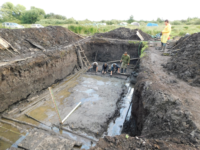 В процессе разведок к югу и западу от ГАО Минино 2 в местах потенциального нахождения деревянных сооружений, наличие которых прогнозировалось по результатам изучения радарограмм, были заложены стратиграфические шурфы 1, 2, оказавшиеся, к сожалению, «пустыми». Однако благодаря им были точнее локализованы палеопротока, а также западная и южная оконечности памятника. Той же цели, а также пополнению серии почвенных данных послужила и серия кернов глубиной до 4 м, сделанных Н.Н. Солодковым ручным буром. Литогенную основу отложений в пределах изучаемого полигона составляют светлые алевритовые суглинки Заболотского палеоозера. В раннеголоценовое время на освободившихся от воды участках формировалась серо-гумусовая почва мощностью около 10 см, но в пределах раскопа 2 она увеличивается до 40–50 см. Здесь же отмечены норы, камеры землероев различной сохранности. Почва разбита на блоки и заметна карманная слоистость – признаки горизонтальных деформаций, свидетельствующие, что эта почва сформировалась в условиях активной седиментации в луговых условиях. Пестроцветный песчаный пролювий, перекрывающий почву, подчёркивает процесс аккумуляции аллохтонного материала. В остальных случаях серо-гумусовая почва погребена гумусотрансформированной торфяной почвой (около 1,0 м). Дресва, угли, многочисленные остатки Betula sp. отражают условия лесо-торфяных геосистем. Аридизация ландшафтов привела к гумусонакоплению в верхней части. Над торфяной почвой лежит слой бурого суглинка. Он обнаружен во всех объектах, кроме западного шурфа. Выделяется два горизонта: нижний – пролювиальный, и верхний – аллювиальный. Слоистый аллювиальный суглинок указывает на переорганизацию палеоландшафтов в позднем голоцене с элювиально-аккумулятивного режима функционирования к супераквальному. На аллювиальном суглинке залегает погребённая гумусо-транформированная почва. Горизонт состоит из хорошо разложившейся органики, пронизан корнями трав, ходами землероев и червей. Перекрывает современная дерново-суглинистая почва на наносном суглинке. Таким образом, в разрезах отмечается разделение литогенных отложений, сходных по составу, но относящихся к разным ландшафтным системам – элювиально-аккумулятивным и супераквальным. Добытые образцы в настоящее время проходят обработку в лабораториях академических институтов (ИГ РАН, ИГАН, ИА РАН).