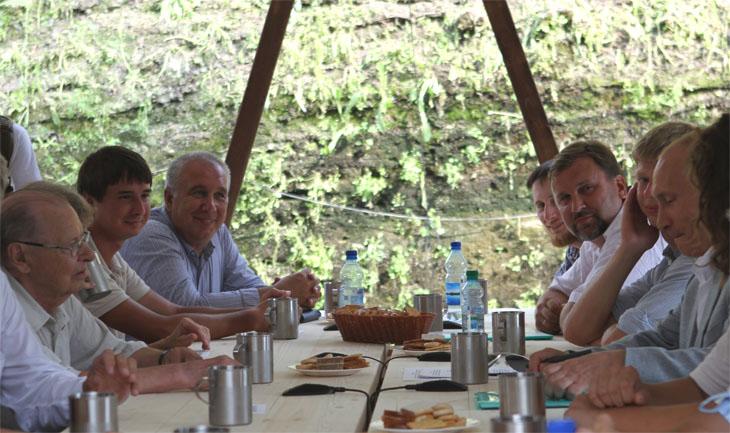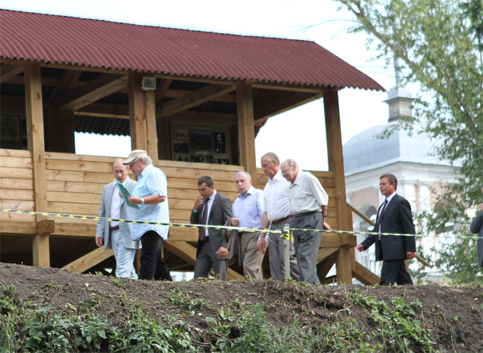 После завершения видеоконференции Председатель Правительства осмотрел Троицкий раскоп и развернутую здесь выставку новейших археологических находок, среди которых была и найденная за несколько дней до этого «тысячная» берестяная грамота. Встреча В.В.Путина с археологами проходила здесь же, на Троицком раскопе, под навесами, сооруженными на участке, где пятиметровый культурный слой в 2009 г. был разобран до материка, на горизонте, с которого в X в. начиналось освоение Людина конца. В беседе приняли участие руководитель Новгородской археологической экспедиции, зав. кафедрой археологии МГУ академик В.Л. Янин, профессор кафедры археологии МГУ Е.А. Рыбина, директор ИИМК РАН член-корреспондент РАН Е.Н. Носов, директор ИА РАН член-корреспондент РАН Н.А. Макаров, доцент Санкт-Петербургского государственного университета И.В. Антипов, ведущий научный сотрудник ИА РАН В.В. Седов, младший научный сотрудник ИИМК РАН А.М. Смирнов, старший преподаватель Новгородского государственного университета Е.В.Торопова, заведующий Центром по организации и обеспечению археологических исследований С.В.Трояновский, студенты кафедр археологии МГУ и СпбГУ.