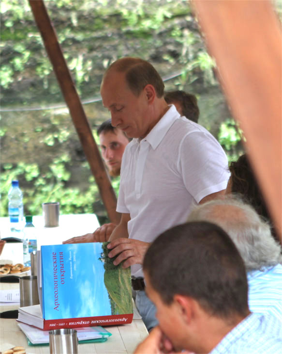 Начиная видеоконференцию в Грановитой палате Новгородского Кремля, В.В. Путин отметил, что археологические раскопки всегда производят большое впечатление, дают возможность ощутить «огромность нашего государства», многообразие древних культур, существовавших на его территории глубину исторического наследия. Далее Председатель Правительства провел беседу с руководителями экспедиций, находившимися на местах раскопок в пяти регионах России. Его собеседниками были заместитель председателя Дагестанского научного центра РАН, профессор кафедры археологии и этнологии Дагестанского университета, руководитель исследований цитадели Нарын-кала в Дербенте М.С. Гаджиев; заместитель директора Института археологии и этнографии СО РАН академик В.И. Молодин, ведущий раскопки могильника эпохи бронзы Тартас I в Новосибирской области; старший научный сотрудник ГИМ С.В.Шполянский, рассказавший о раскопках древнерусских селищ в Суздальском Ополье; заведующий отделом классической археологии Института археологии РАН В.Д. Кузнецов, руководитель полевых работ на территории античной Фанагории; старший преподаватель кафедры археологии МГУ В.С. Житенев, ведущий изучение палеолитических наскальных изображений и культурных напластований в Каповой Пещере в Башкирии. В поле зрения участников видеоконференции в Грановитой палате оказались памятники разных хронологических периодов, дающие представление о разнообразии археологических объектов, на которых ведут работы ученые, и о специфике культурных традиций различных регионов в древности. Археологи рассказали о научных результатах полевых работ, продемонстрировали наиболее яркие находки, проинформировали В.В.Путина о том, как организованы работы и как осуществляется их финансирование. Председатель Правительства задавал вопросы о правовом статусе земель, на которых производятся раскопки, о путях более эффективной охраны объектов археологического наследия, о современных методах естественных и технических наук, применяемых в археологии. Обсуждались вопросы о возможности организации археологического музея-заповедника в Фанагории и о придании Дербентскому музею-заповеднику федерального статуса. В завершение видеоконференции В.В. Путин поздравил всех собравшихся с Днем бересты, который отмечается в нашей стране как общий археологический праздник.