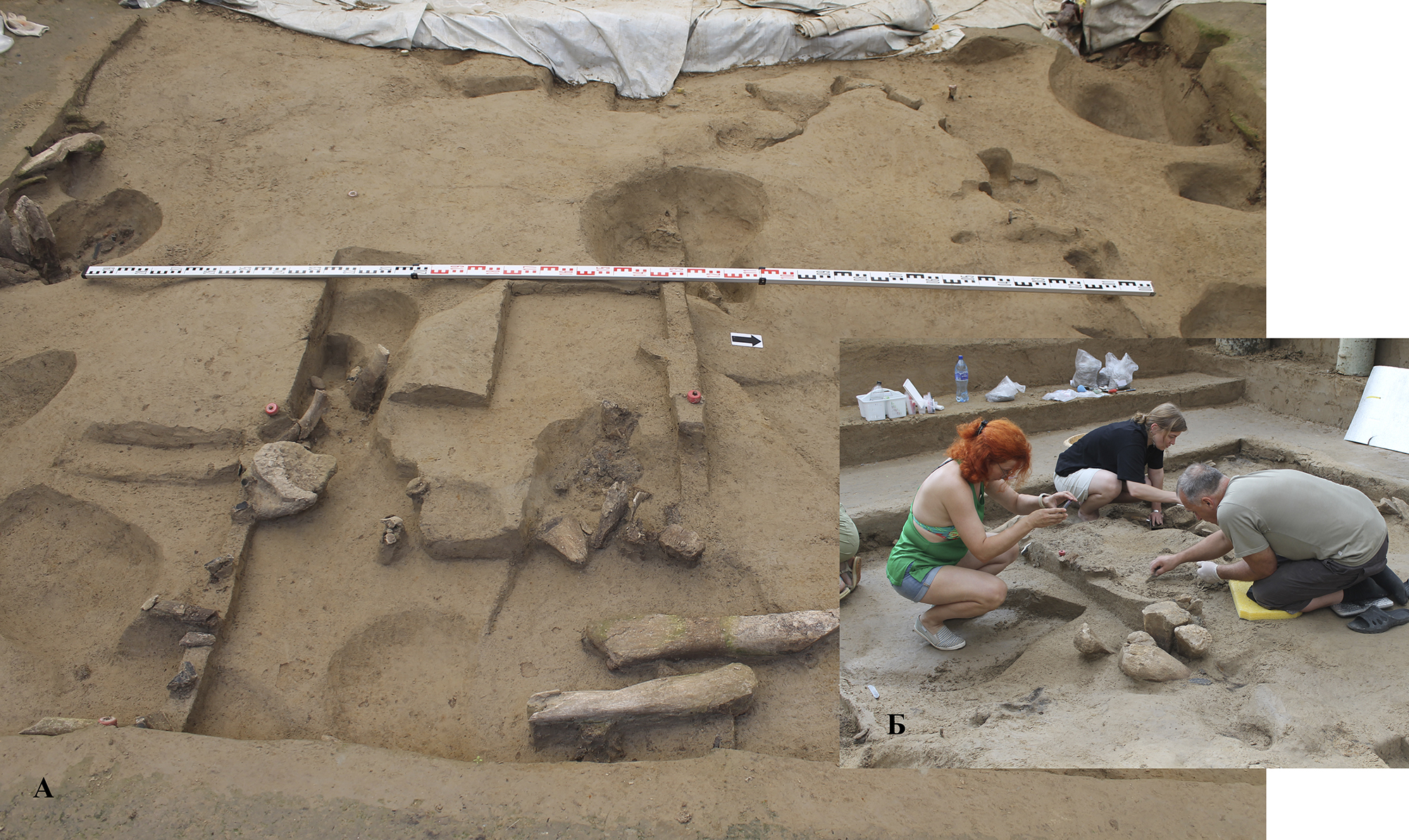 Раскоп В. А – общий вид на углублённые объекты. Б – рабочий момент