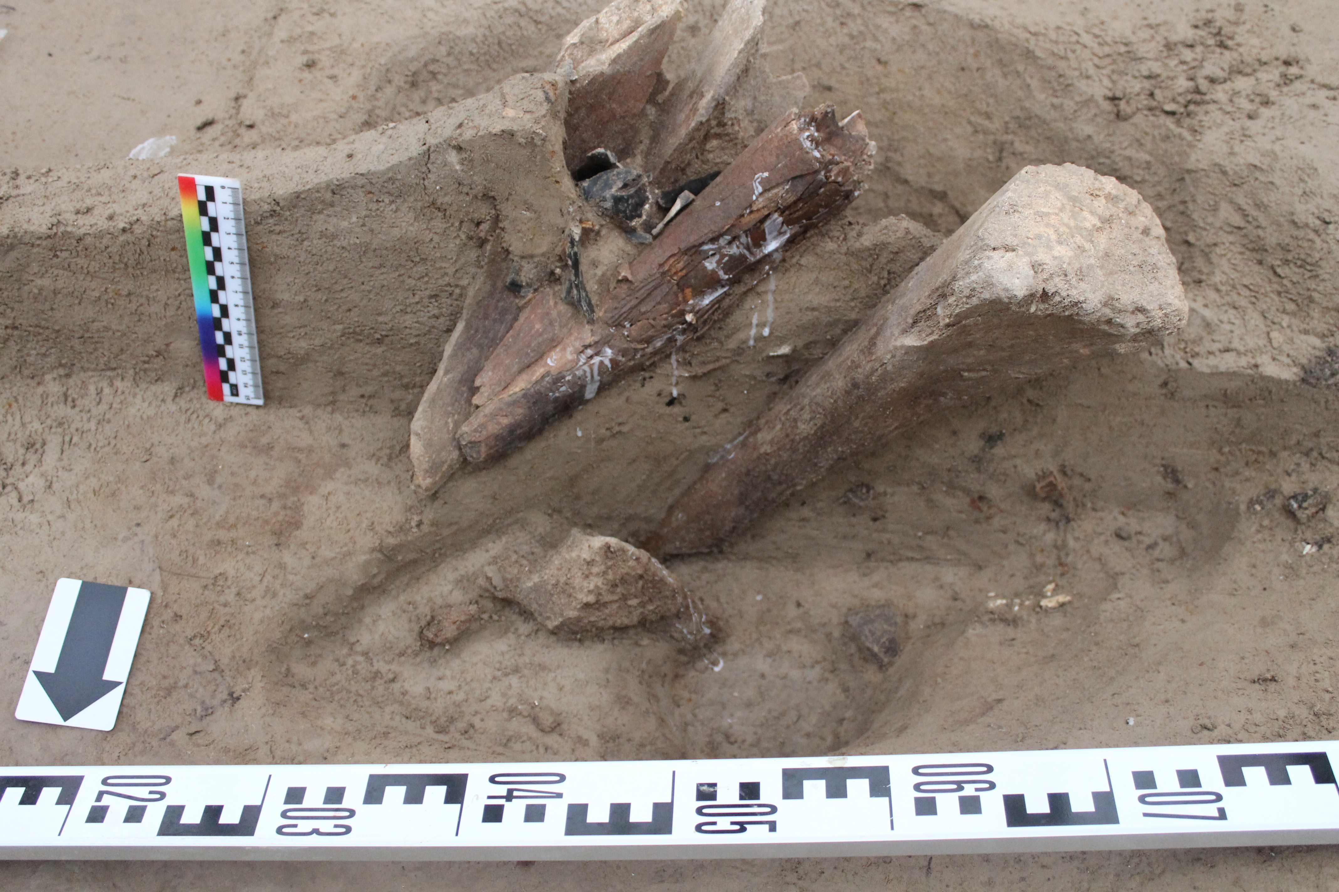 Раскоп В. Фрагмент бивня мамонта с регулярными нарезками на его поверхности в заполнении ямы. Рабочий момент процесса консервации