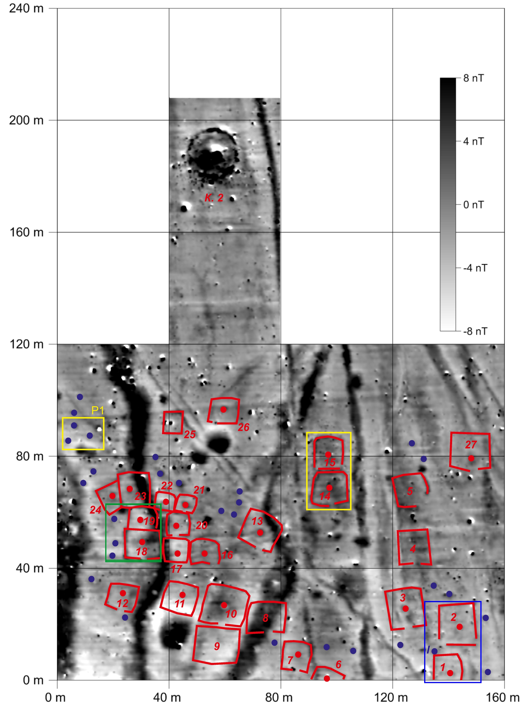 Результаты магнитометрического обследования 2012 г. участка 2 курганного могильника Левоподкумский 1. Синим цветом обозначен участок раскопок 2012 г., зеленым – 2024 г., желтым – участки раскопок 2025 г.