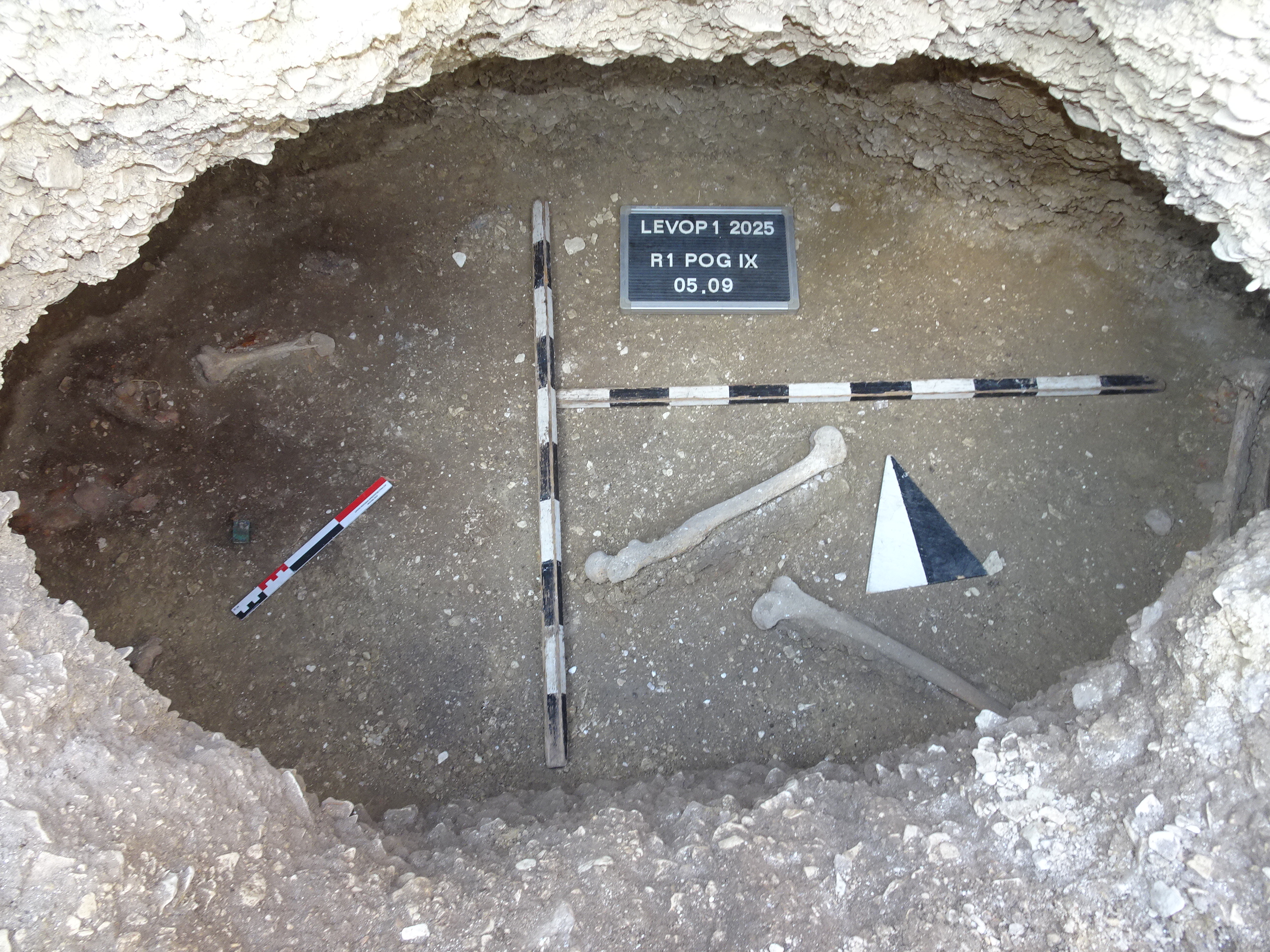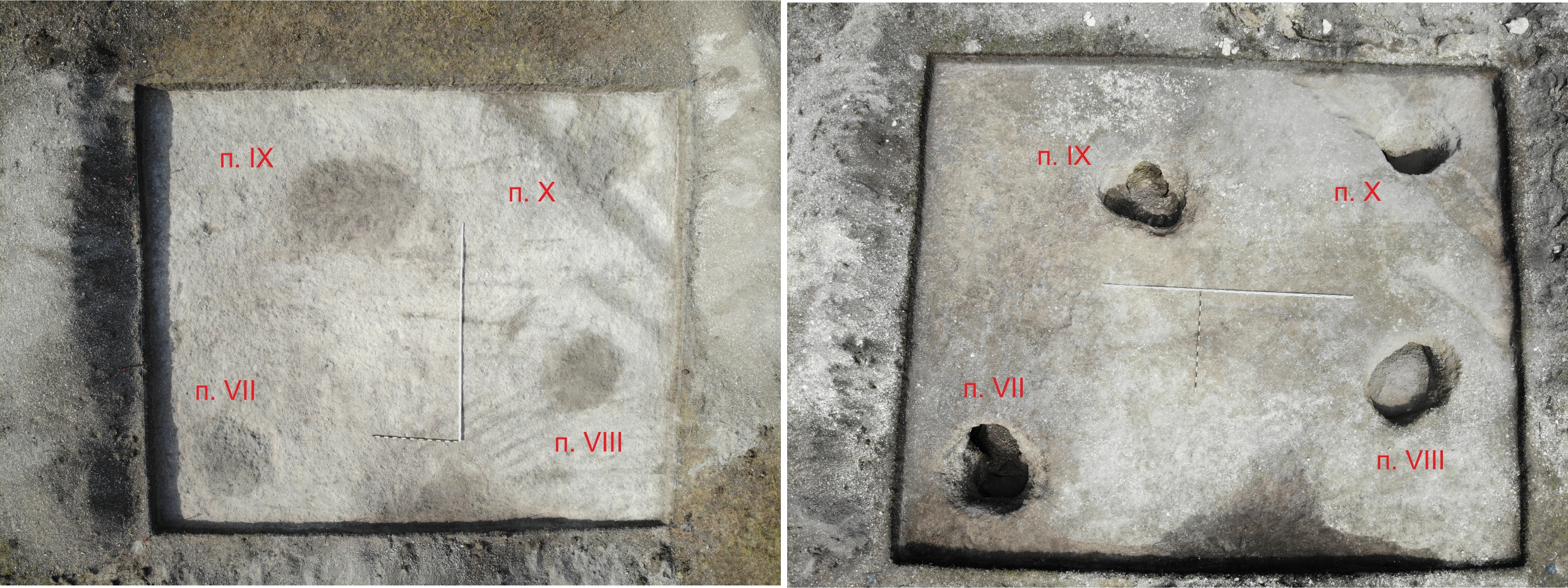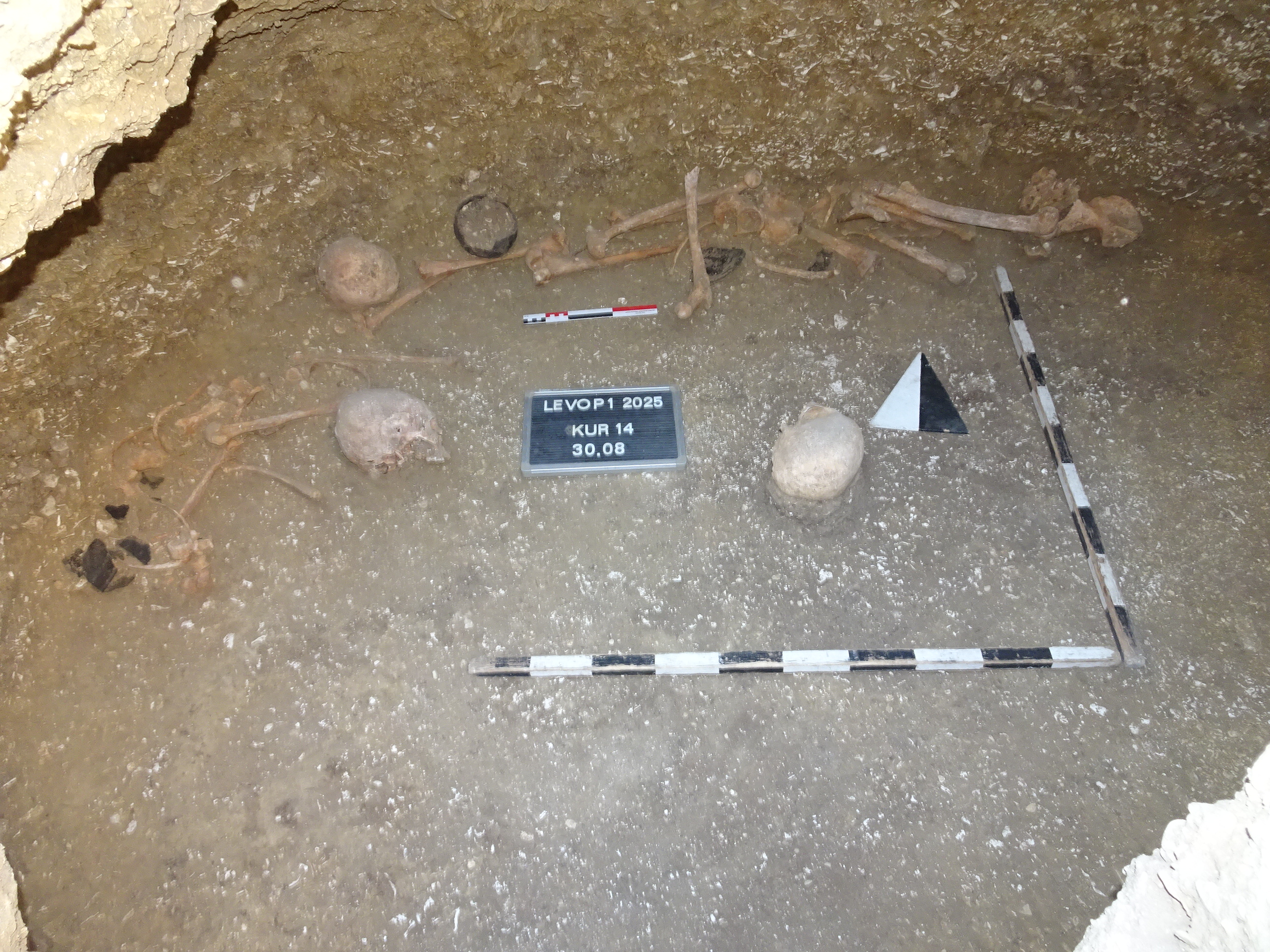 Результаты раскопок погребений на раскопе 1 – зачистка на уровне материковой скалы (слева) и погребения после выборки заполнения (справа)