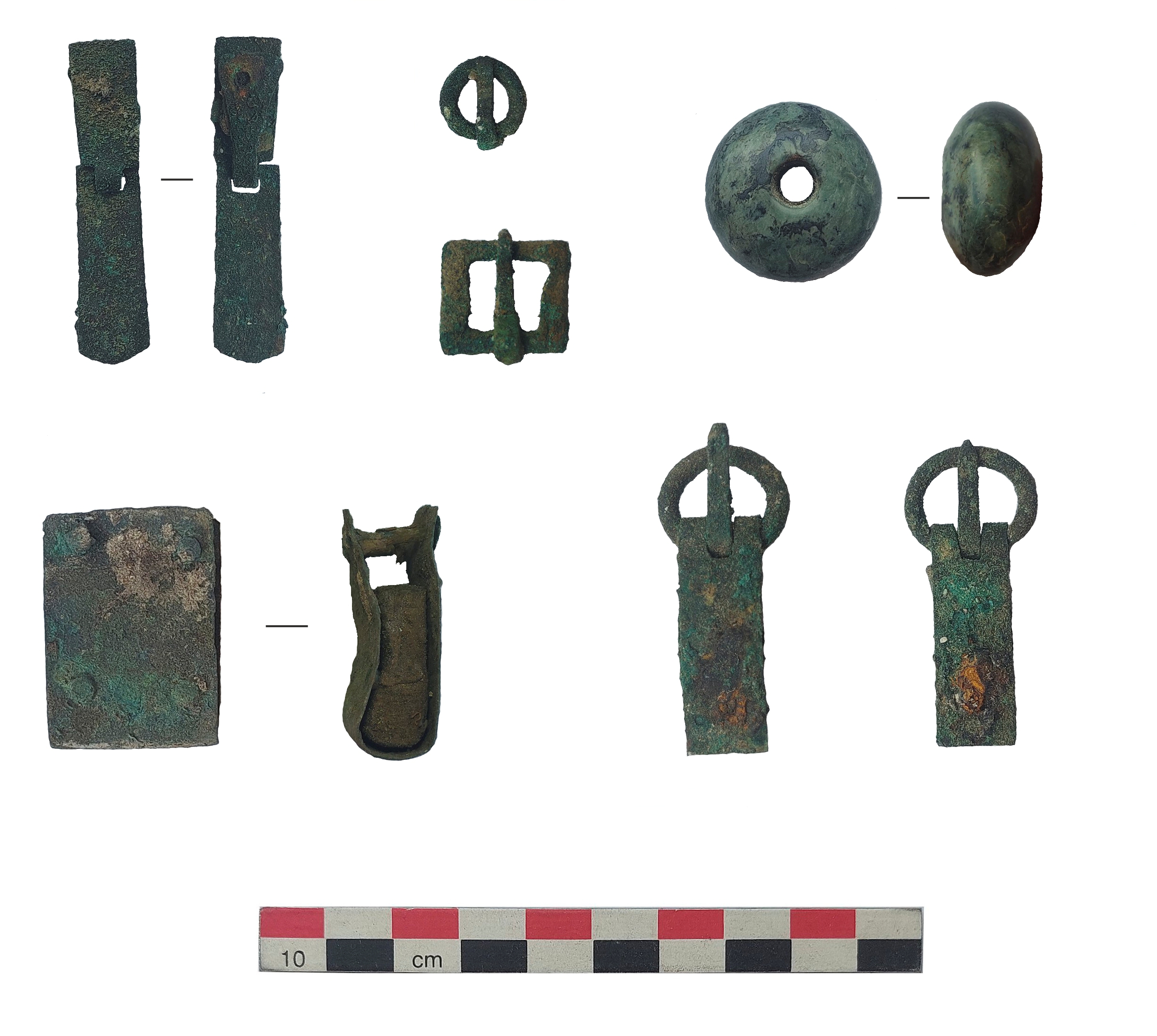 Раскоп 1 был устроен над аномалиями с повышенным магнитным полем, которые отражают гумусированное заполнение грабительских лазов во входных ямах захоронений. Здесь было исследовано четыре бескурганных погребения. Три из них (погр. VII, IX и X) представляли из себя катакомбы IV типа (по К.Ф. Смирнову); погребение VIII было совершено в подбойной могиле, сильно разрушенной при ограблении. В этом захоронении был найден яркий инвентарь, сопровождавший двух взрослых погребенных. Он включал в себя железные наконечники копья и стрелы, железные и бронзовые пряжки, бронзовый наконечник-подвеску, стеклянные и каменные бусины, в том числе бусину от портупеи меча. По характерным предметам обувной гарнитуры данный комплекс предварительно отнесен ко второй половине II – началу III в. н.э. В остальных погребениях, исследованных на раскопе 1, были обнаружены предметы, характерные для середины – второй половины III в. н.э.
