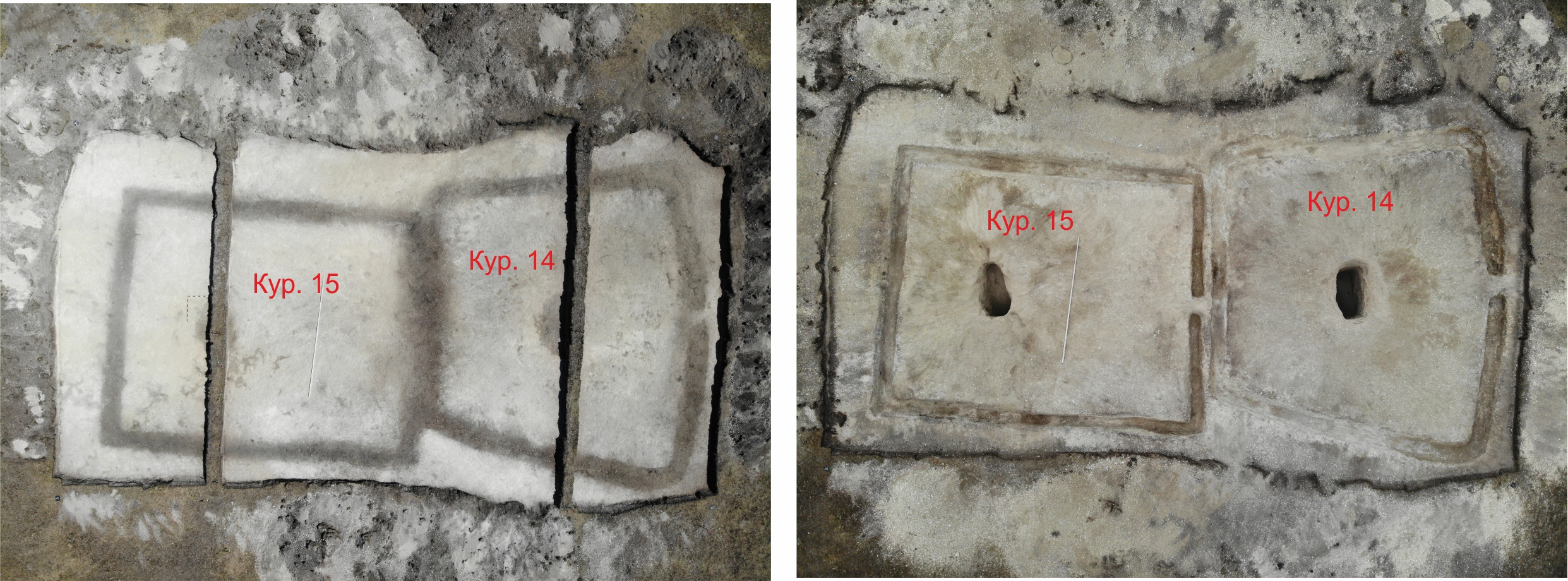 Результаты раскопок курганов 14 и 15 – зачистка на уровне материковой скалы (слева) и ровики и погребения после выборки заполнения (справа)
