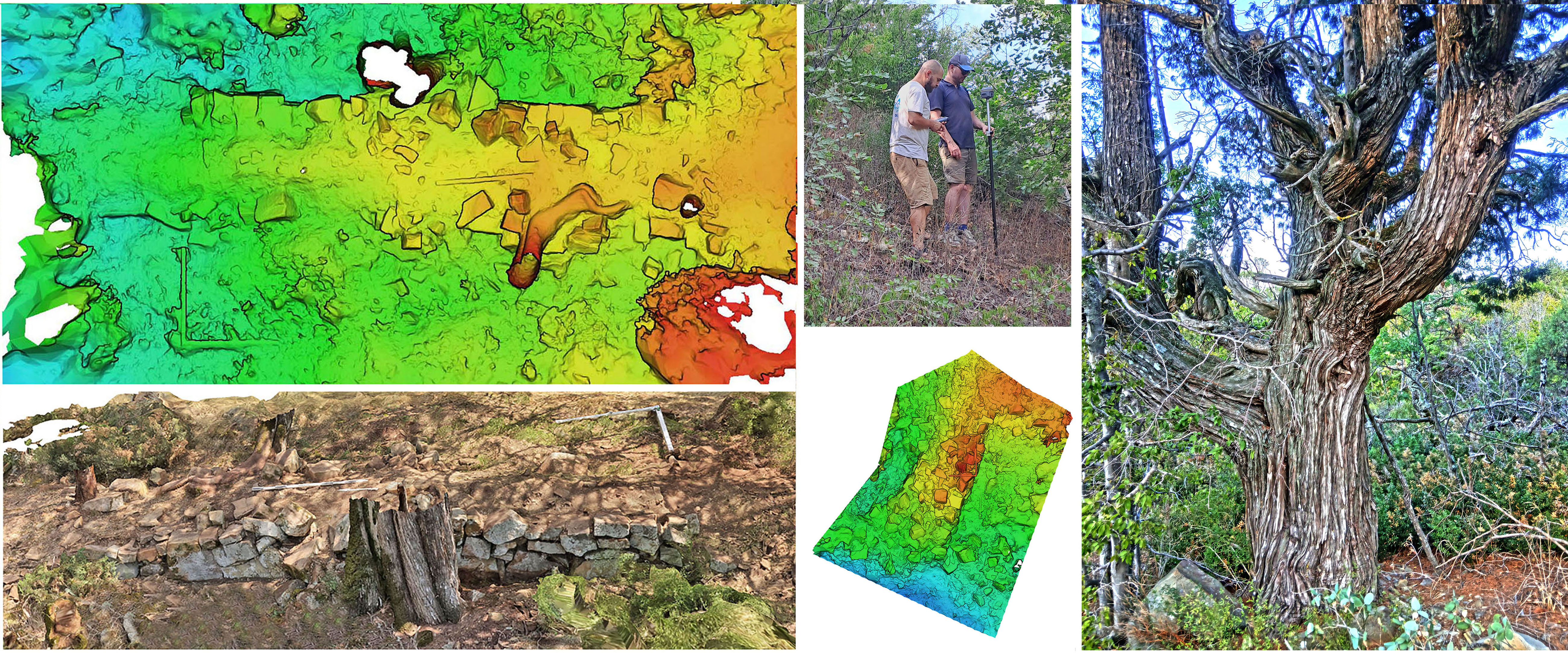 Окрестности мыса Малый Утриш: 1,2 – глинобитная (?) стена лицевыми каменными обкладками (ортофото и карта высот);