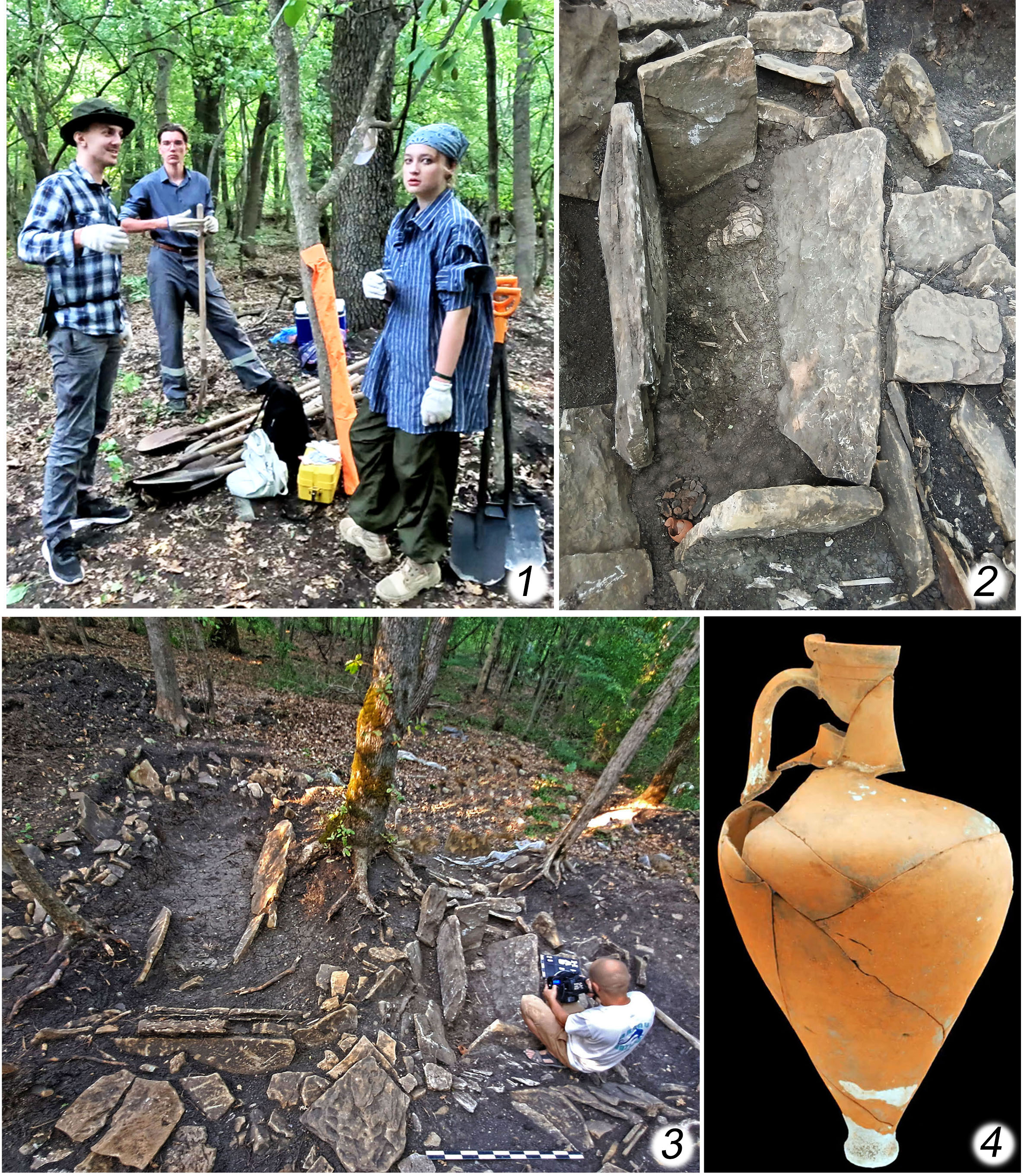 2 – захоронение ребенка в каменном ящике; 3 – фотограмметрическая съемка объекта;
