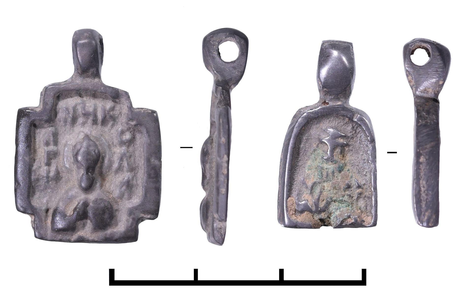 Другим важнейшим объектом исследований 2025 г. был ров, выкопанный перед древо-земляной стеной. В конце XIV в. ров отгородил площадку детинца города, на которой размещались богатые усадьбы, принадлежавшие, вероятно, военно-служилой аристократии. В 2024 г. на территории одной из таких усадеб в комплексе XIV в. были найдены 2 миниатюрные нательные иконки из медных сплавов с рельефными изображениями святых. На одной из иконок сохранилась кириллическая надпись, поясняющая, что на ней изображен св. Николай, почитание которого было широко распространено в Рязанской земле.