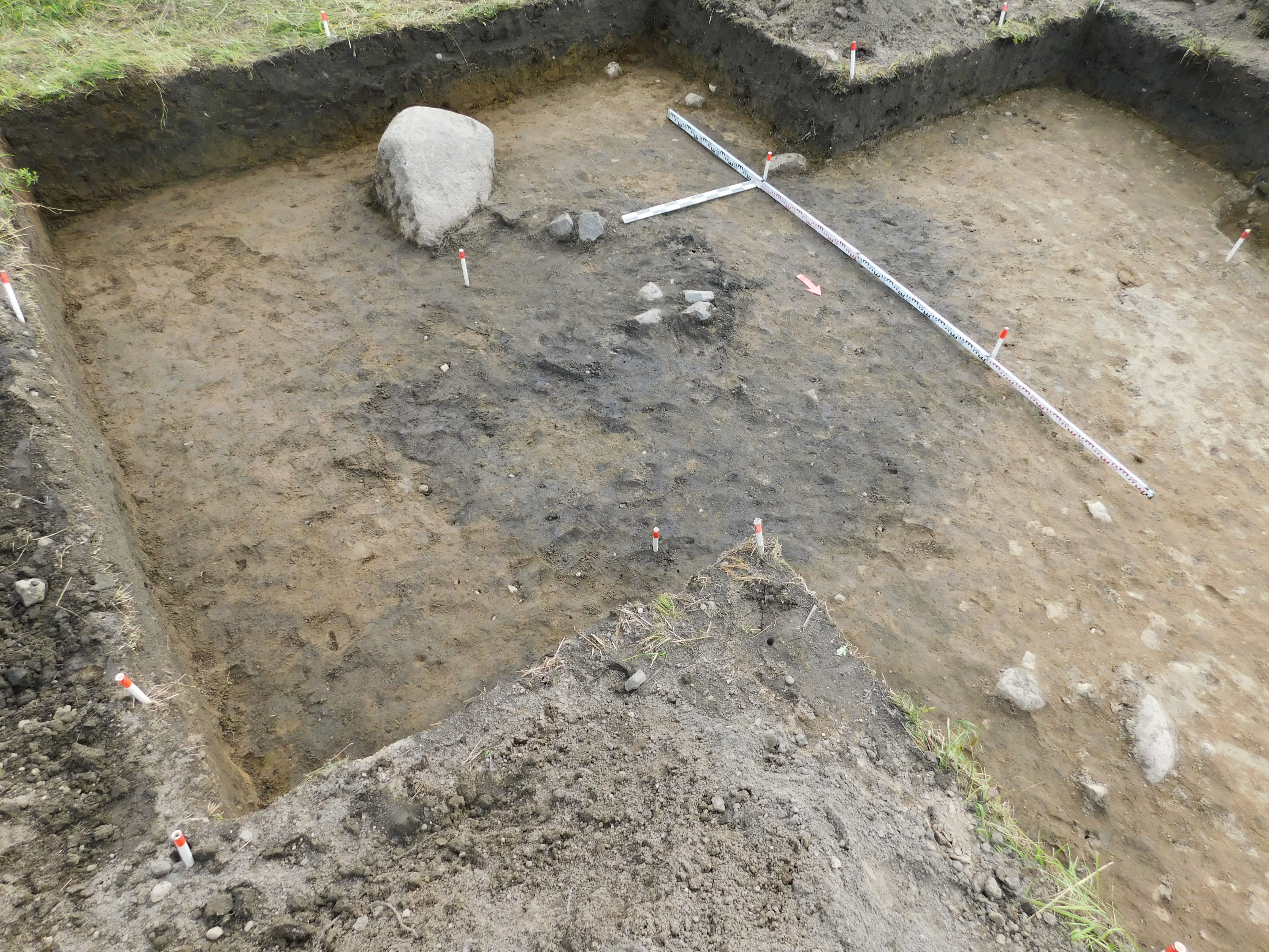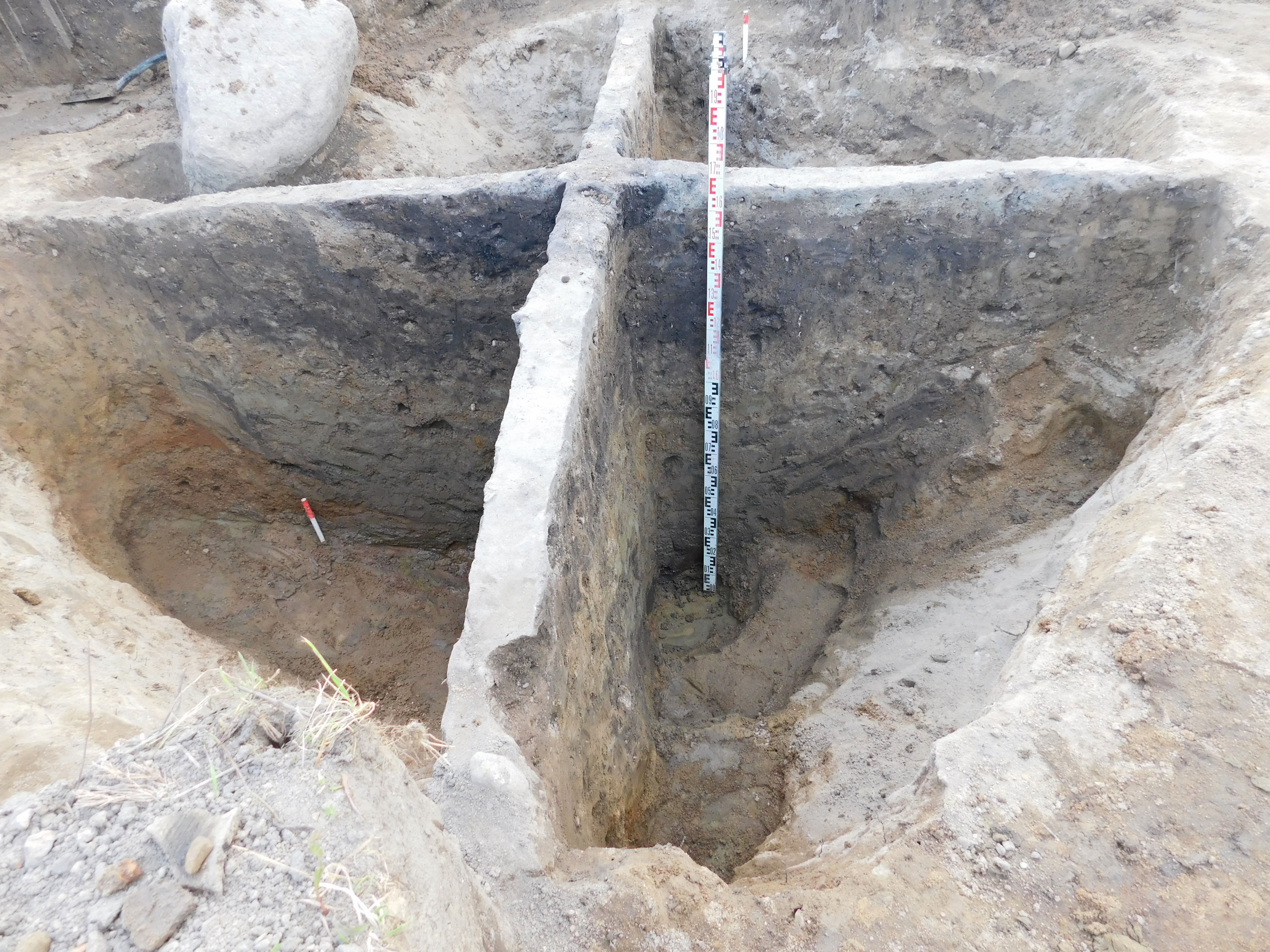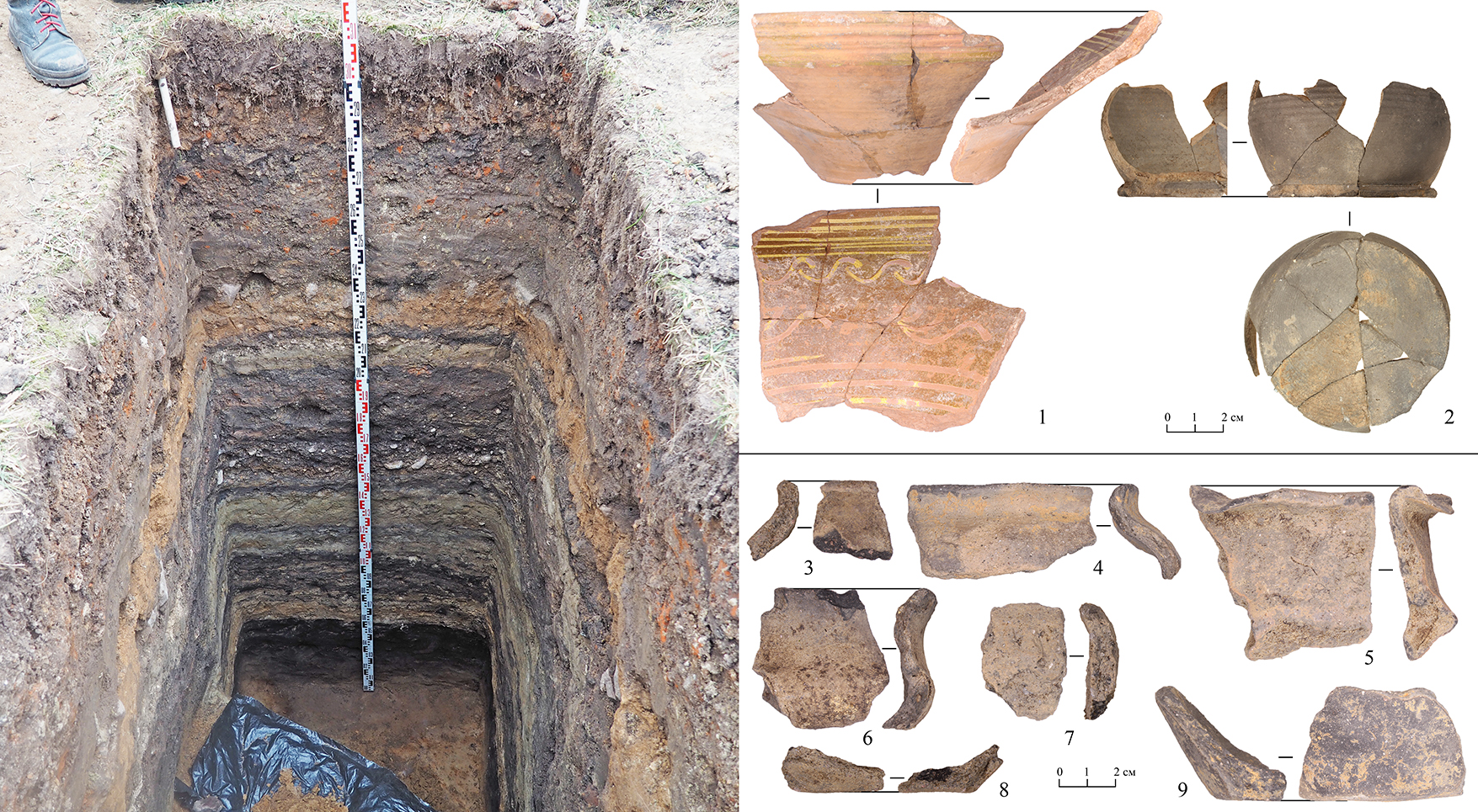 В результате работ в раскопе выявлены 4 объекта, из которых наибольшим значением для целей исследования обладал объект 1, расположенный в юго-западной части раскопа. Он представлял собой заглубленную в материк яму, которая имела размер по длине, ширине и глубине соответственно 4 х 4 х 2 м. Верхнюю часть ее засыпки составил слой темно-коричневой супеси с углем, камнями и печиной мощностью до 0,4 м, при разборе которого найдены бронзовый перстень, оселок и более 200 фрагментов раннегончарных сосудов. Общая датировка материала составляет XI–XIII вв. Ниже выявлен слой темно-коричневой супеси с песком мощностью до 1,1 м, под которым располагался утрамбованный слой темно-коричневого суглинка мощностью до 0,5 м, он лежал на дне постройки и представлял собой гидроизоляцию ее нижней части. Предварительно объект атрибутируется как погреб и датируется XI–XIII вв. Таким образом, проведенное исследование позволяет определить участок памятника перспективным для дальнейшего поиска жилых и хозяйственных построек и последующей реконструкции внутренней планировки селища.