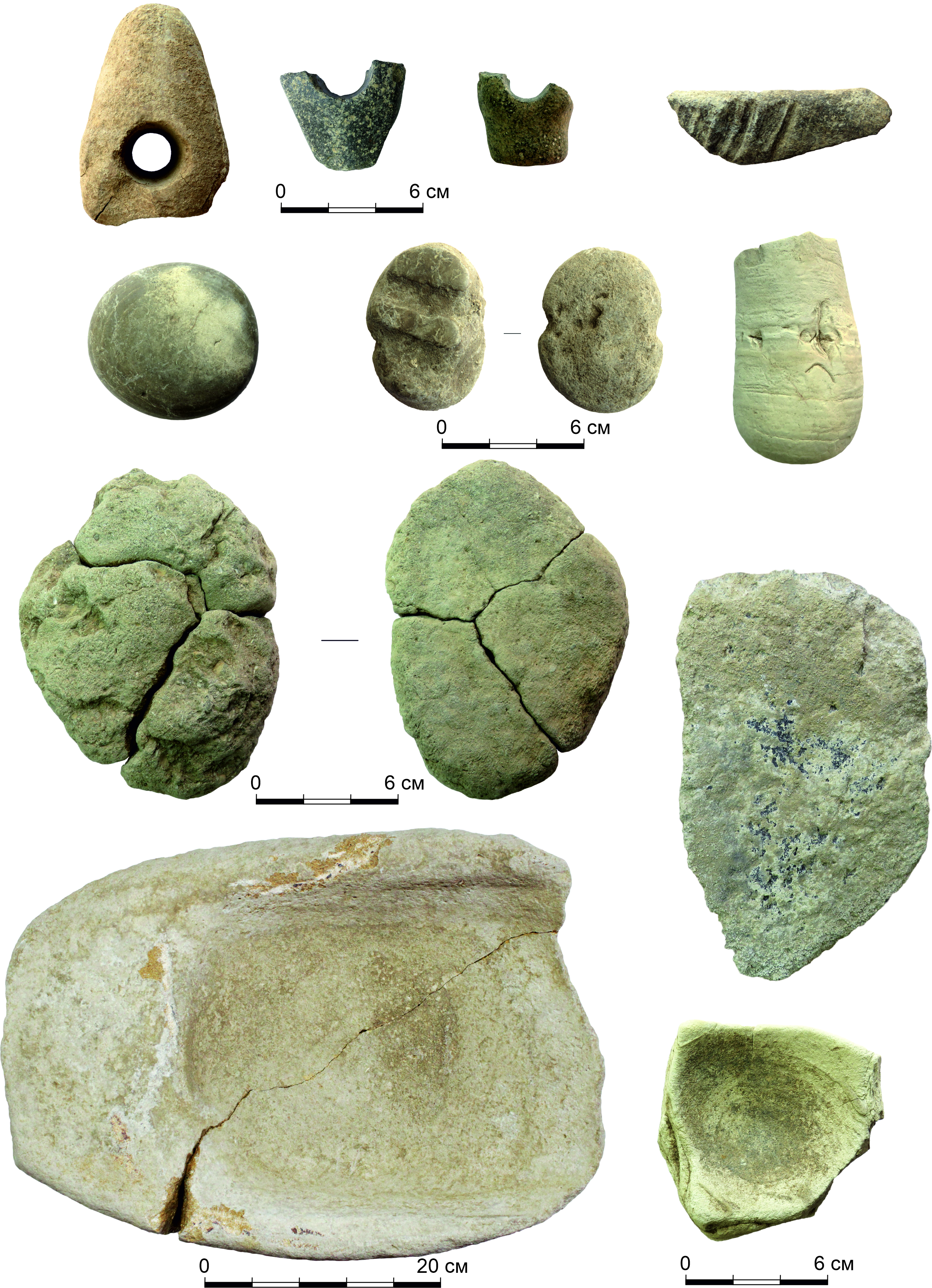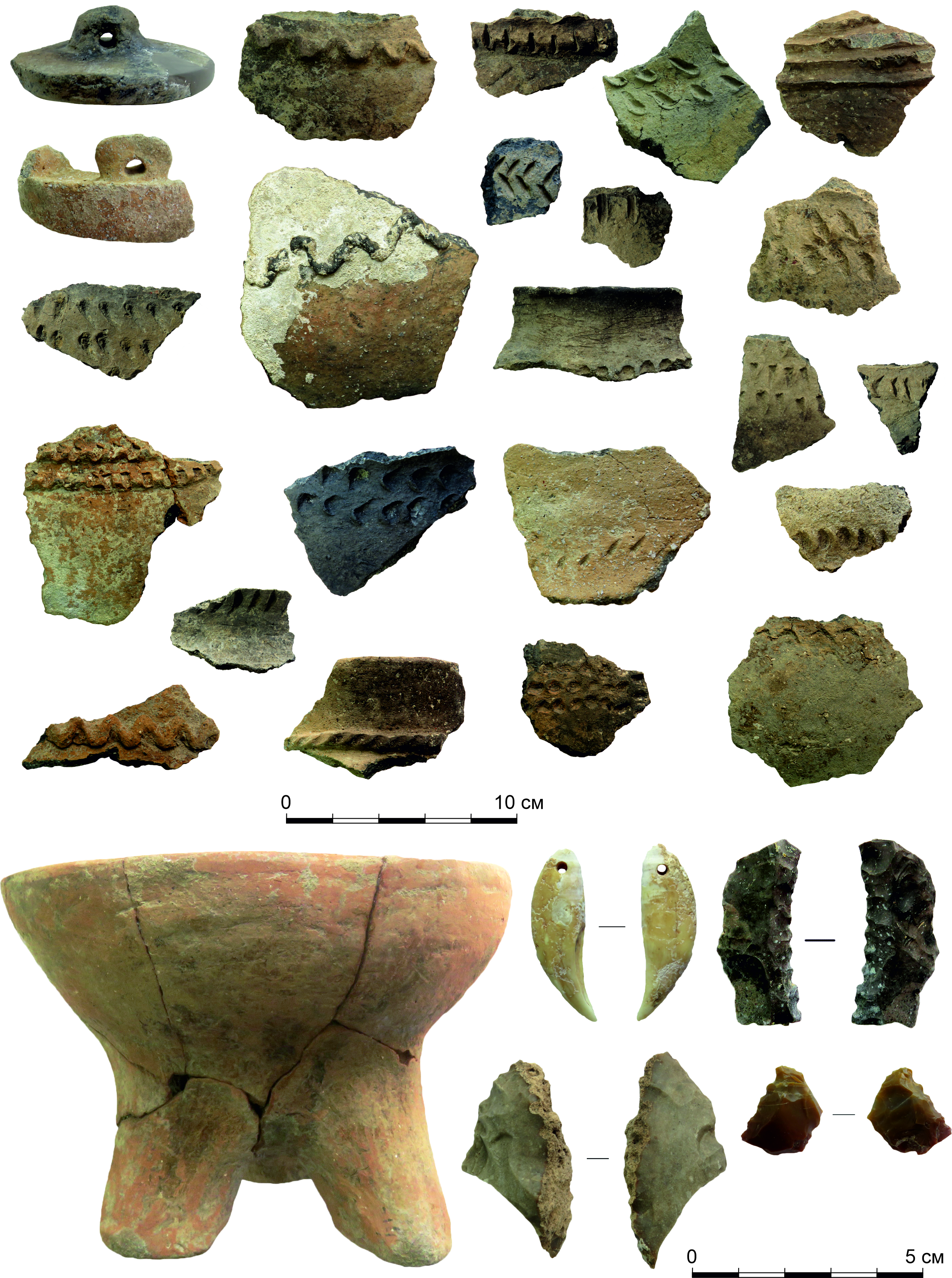 Находки: фрагменты орнаментированных лепных сосудов, крышки, изделия из кремния, подвеска из клыка животного, красноглиняный трипод