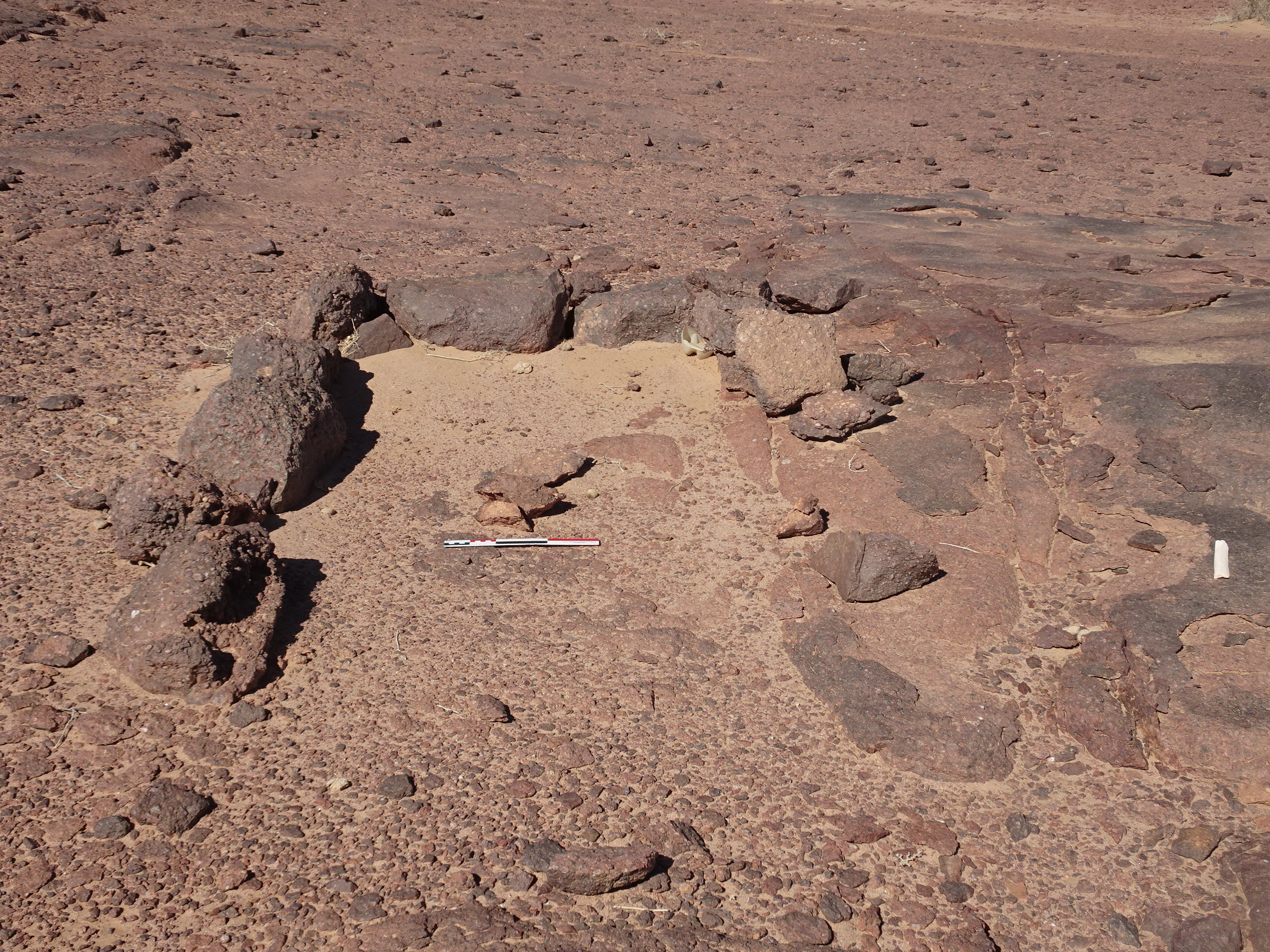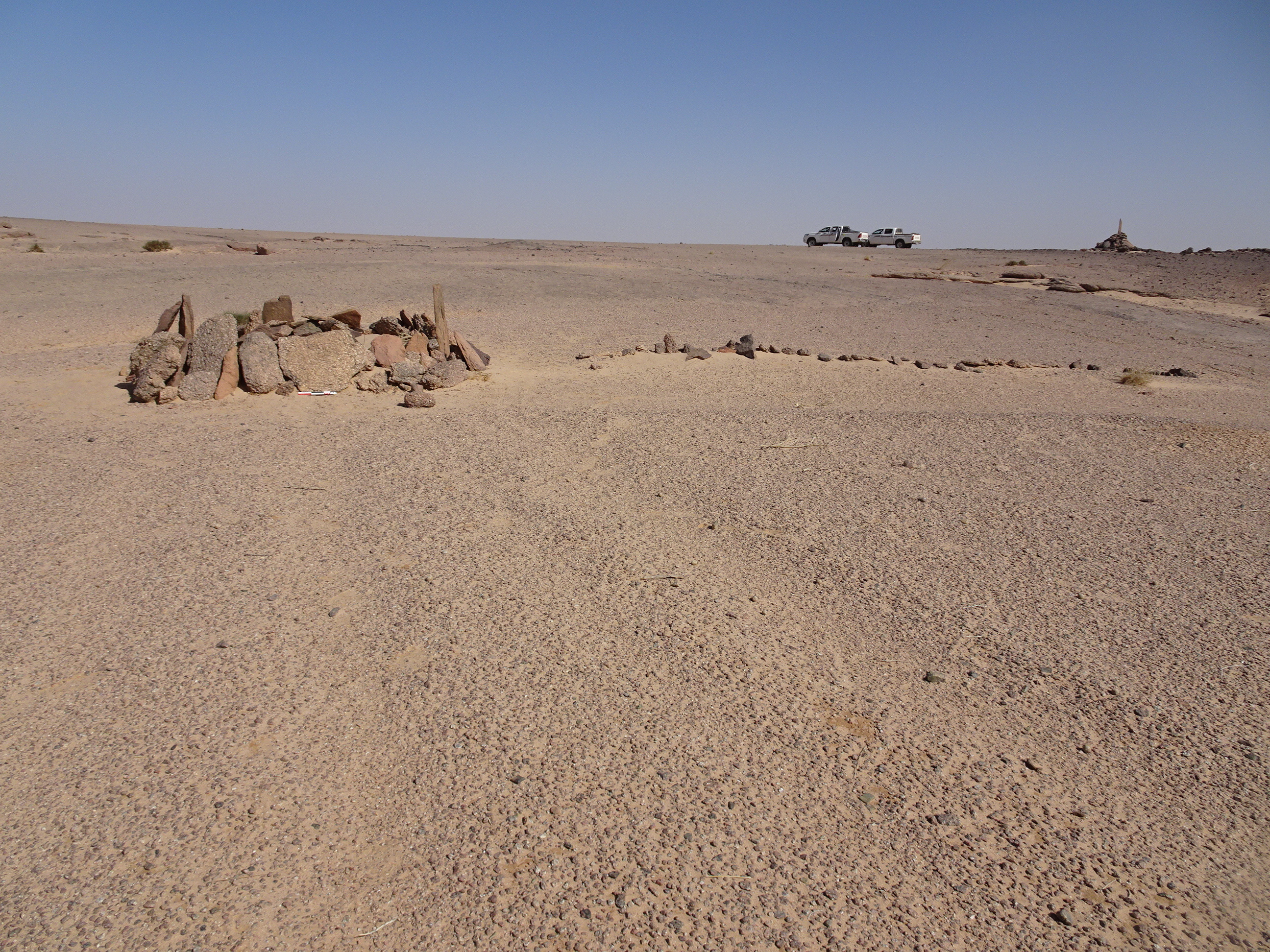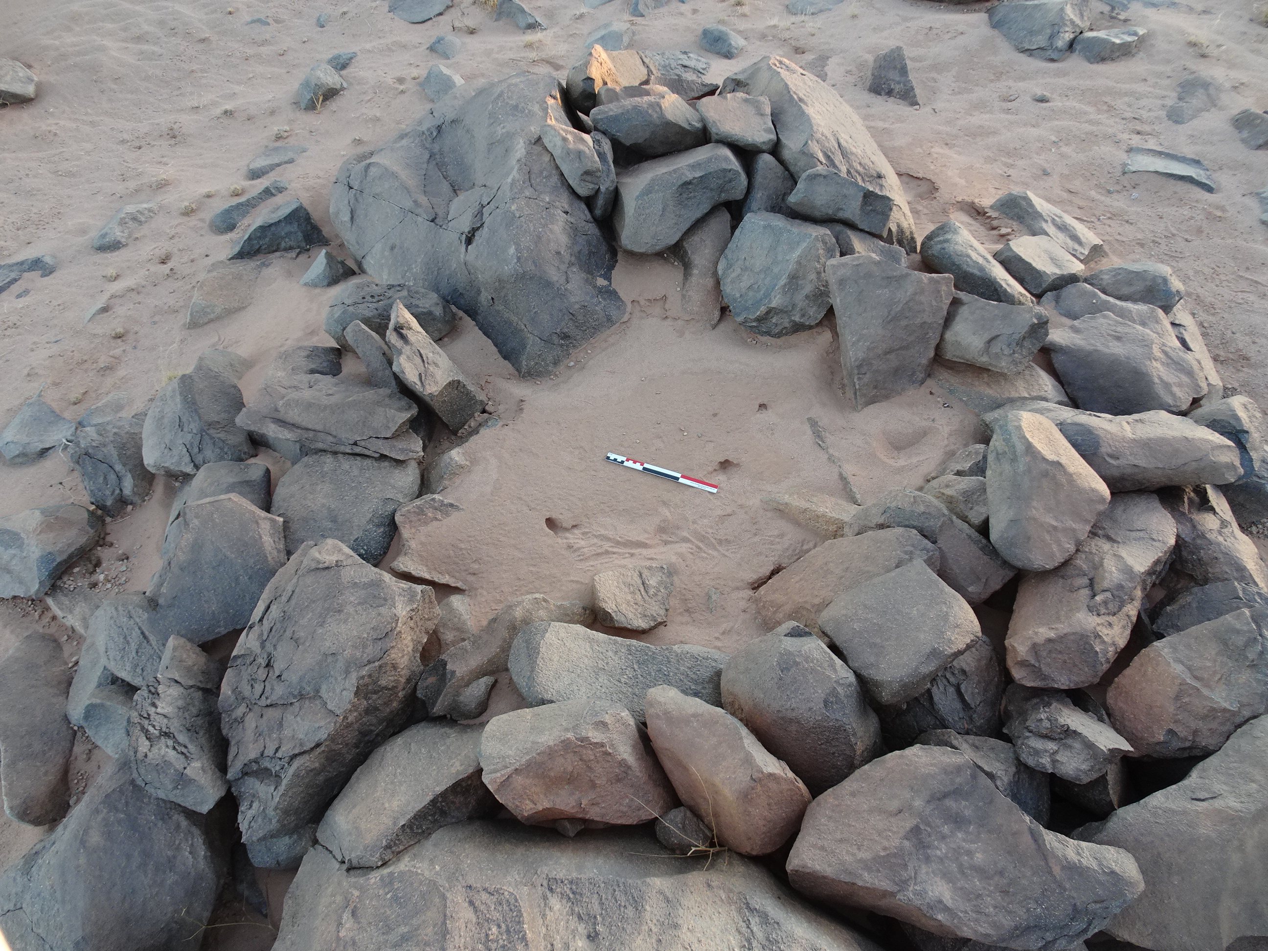 Вид с Ю на полукруглую каменную структуру у кур. 2 могильника Бир Могрейн 2