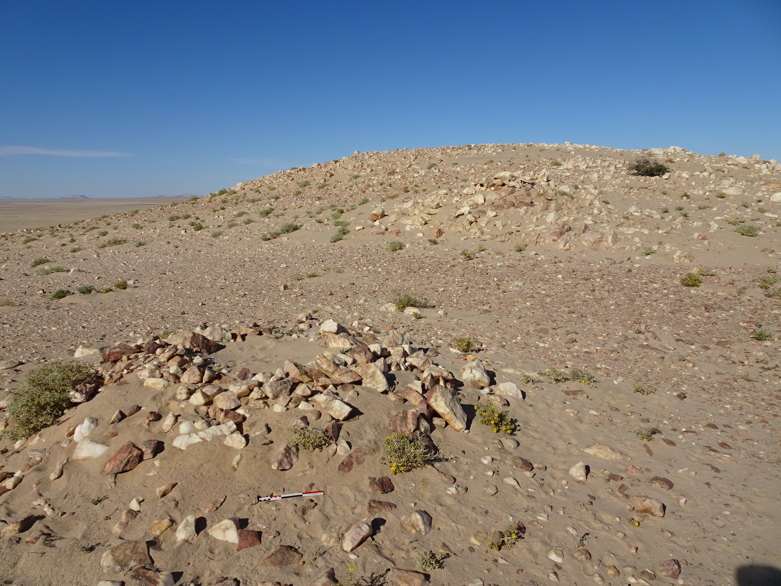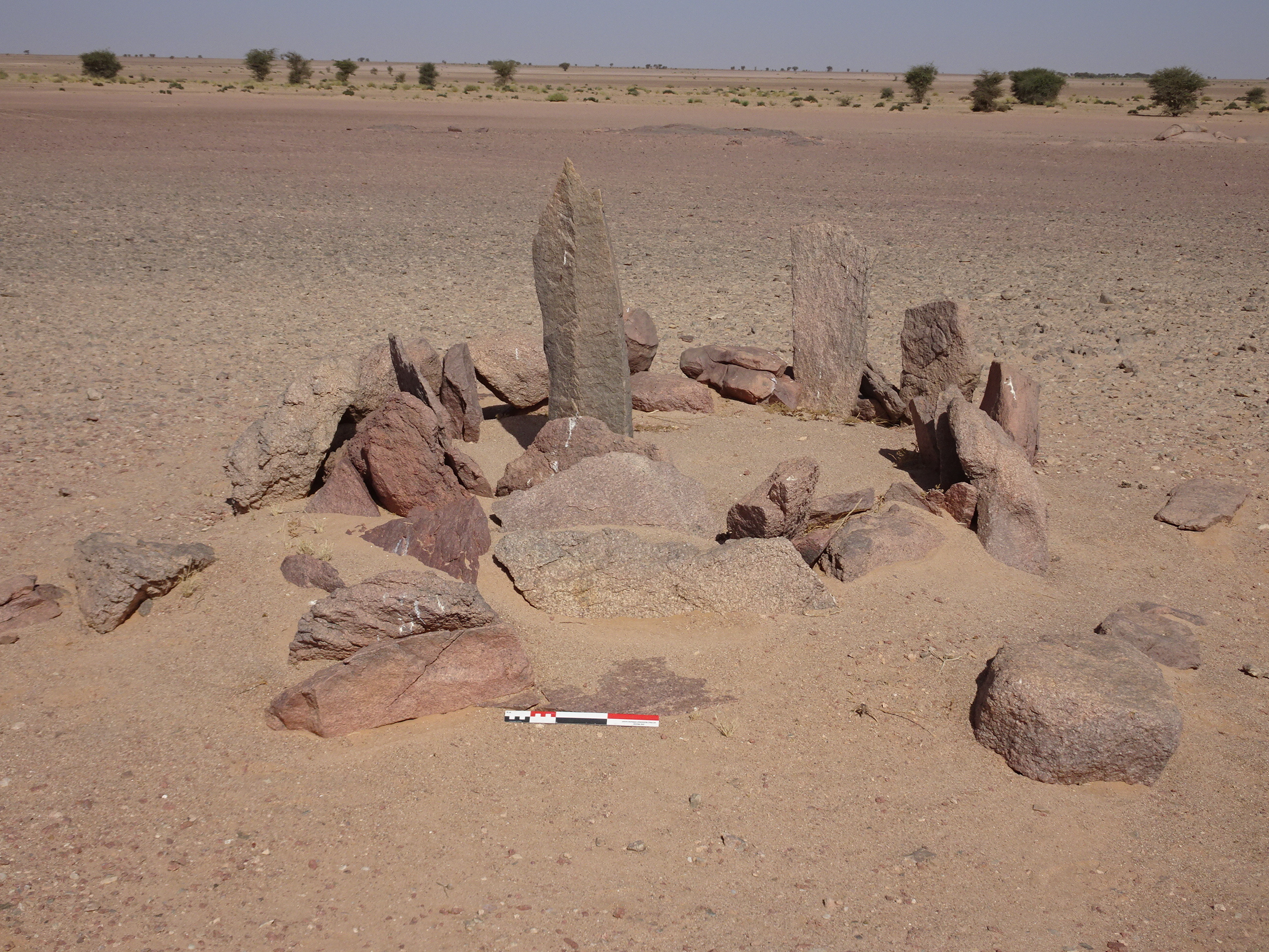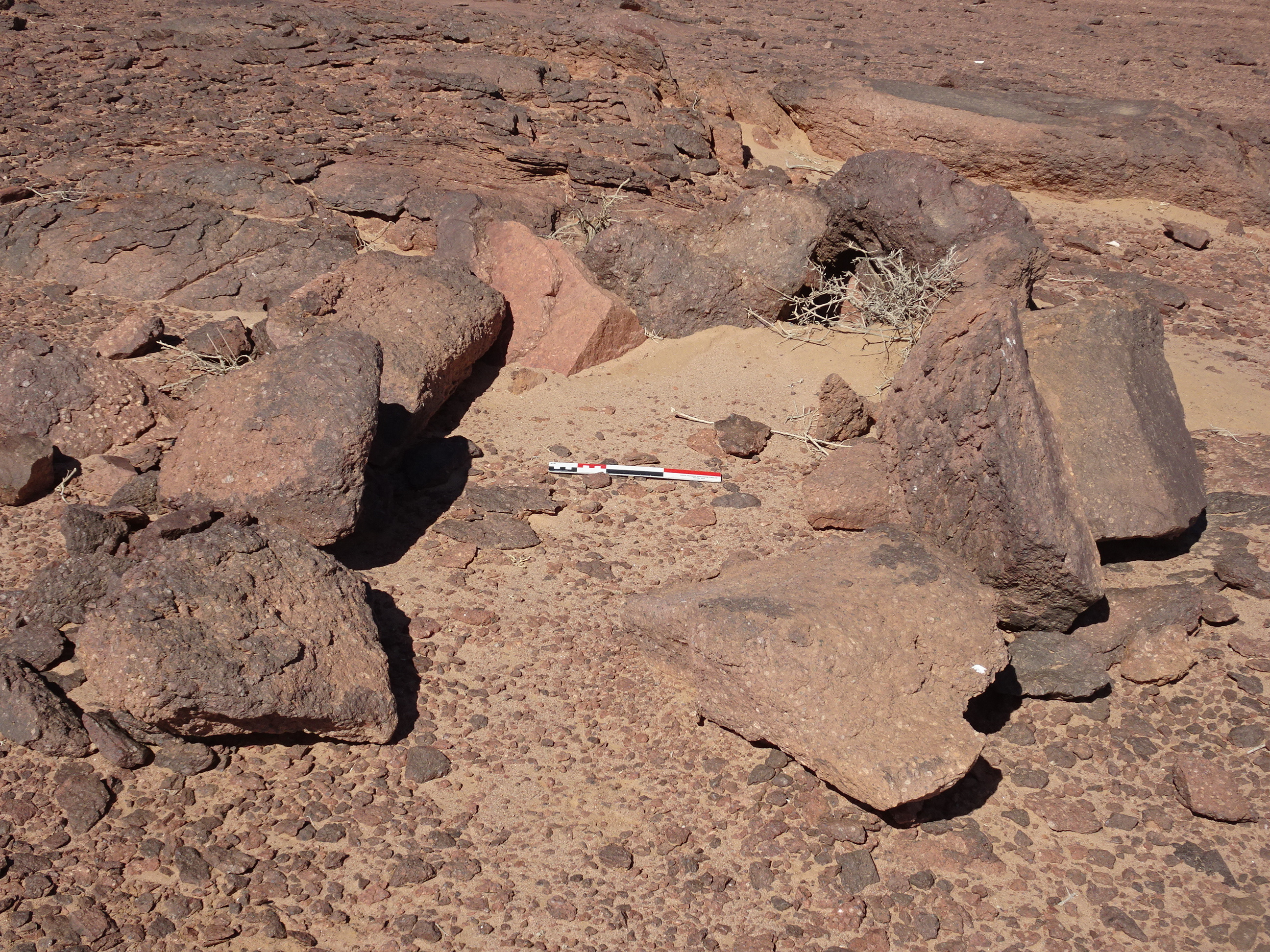 Вид с Ю на полукруглую каменную структуру у кур. 2 могильника Бир Могрейн 2