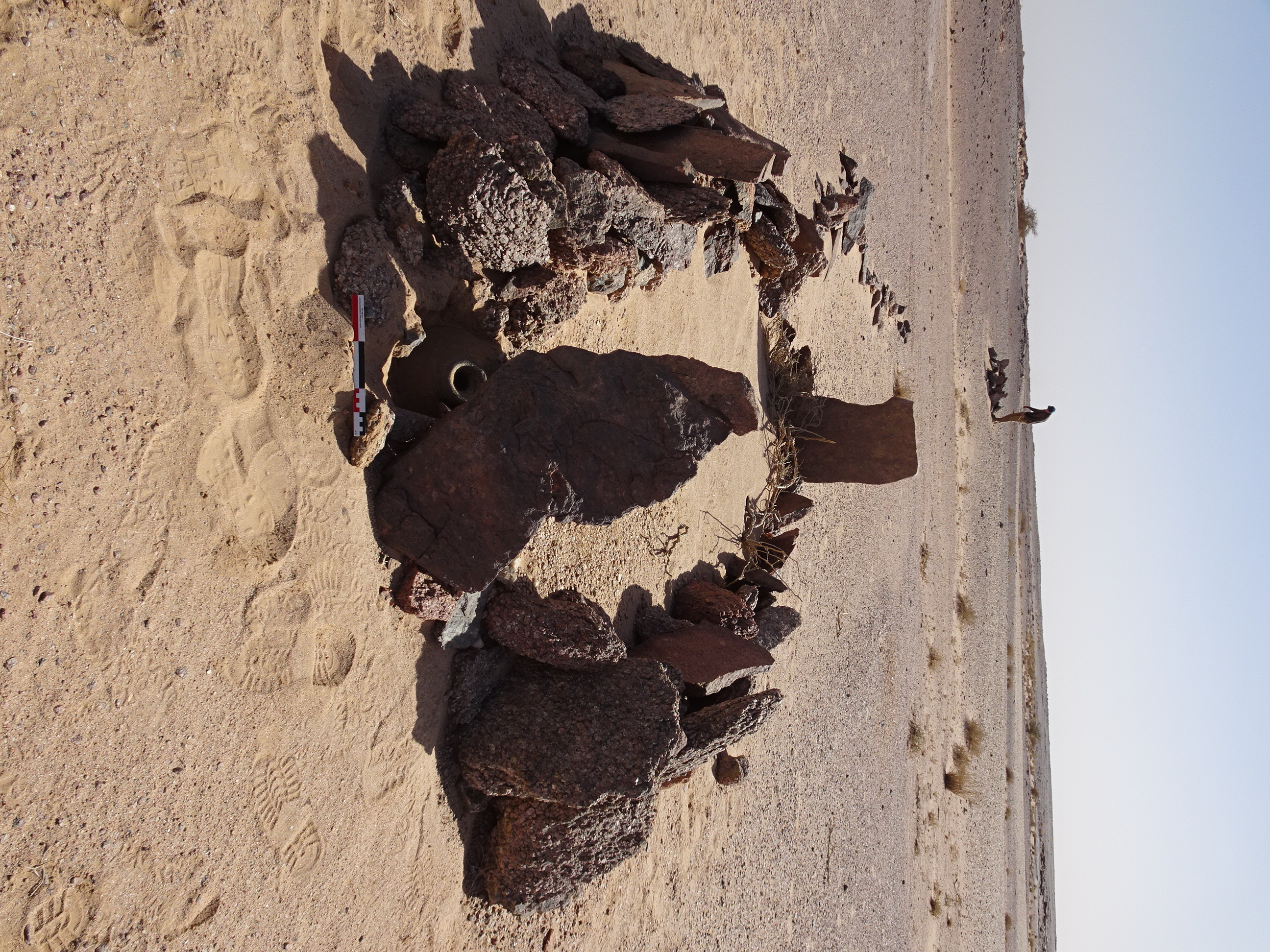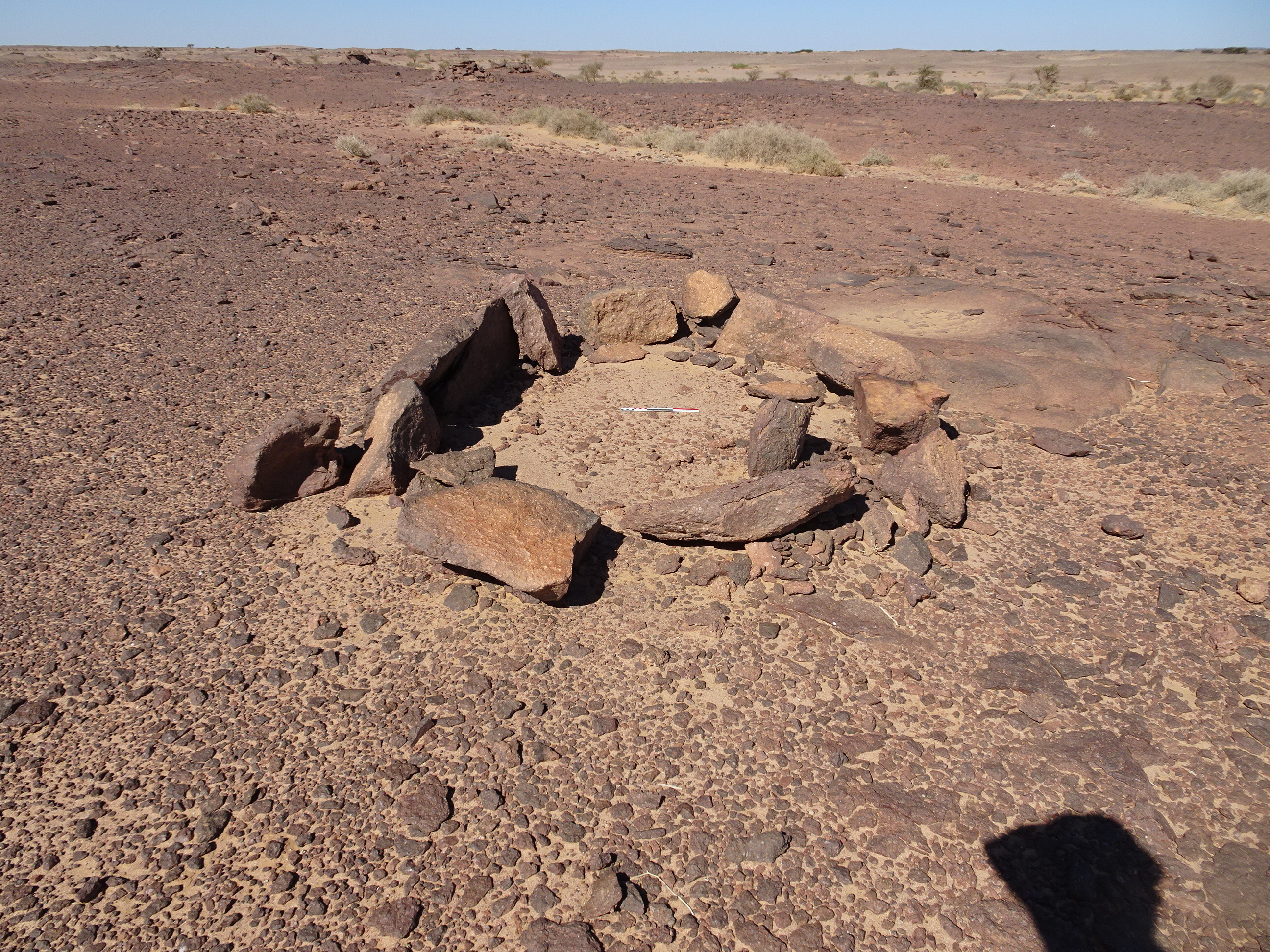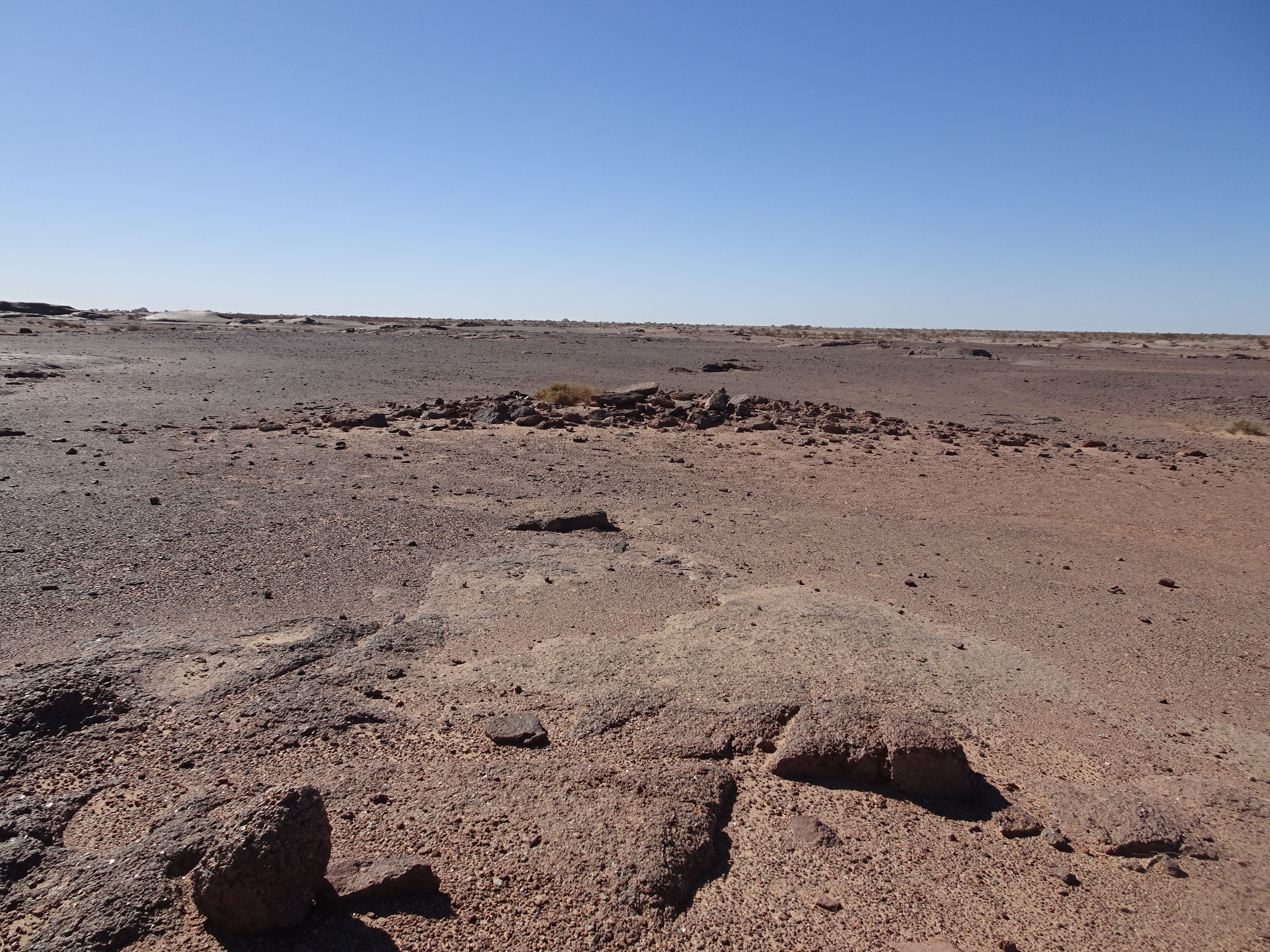 Вид с Ю на круглую каменную структуру у кур. 2 могильника Бир Могрейн 2