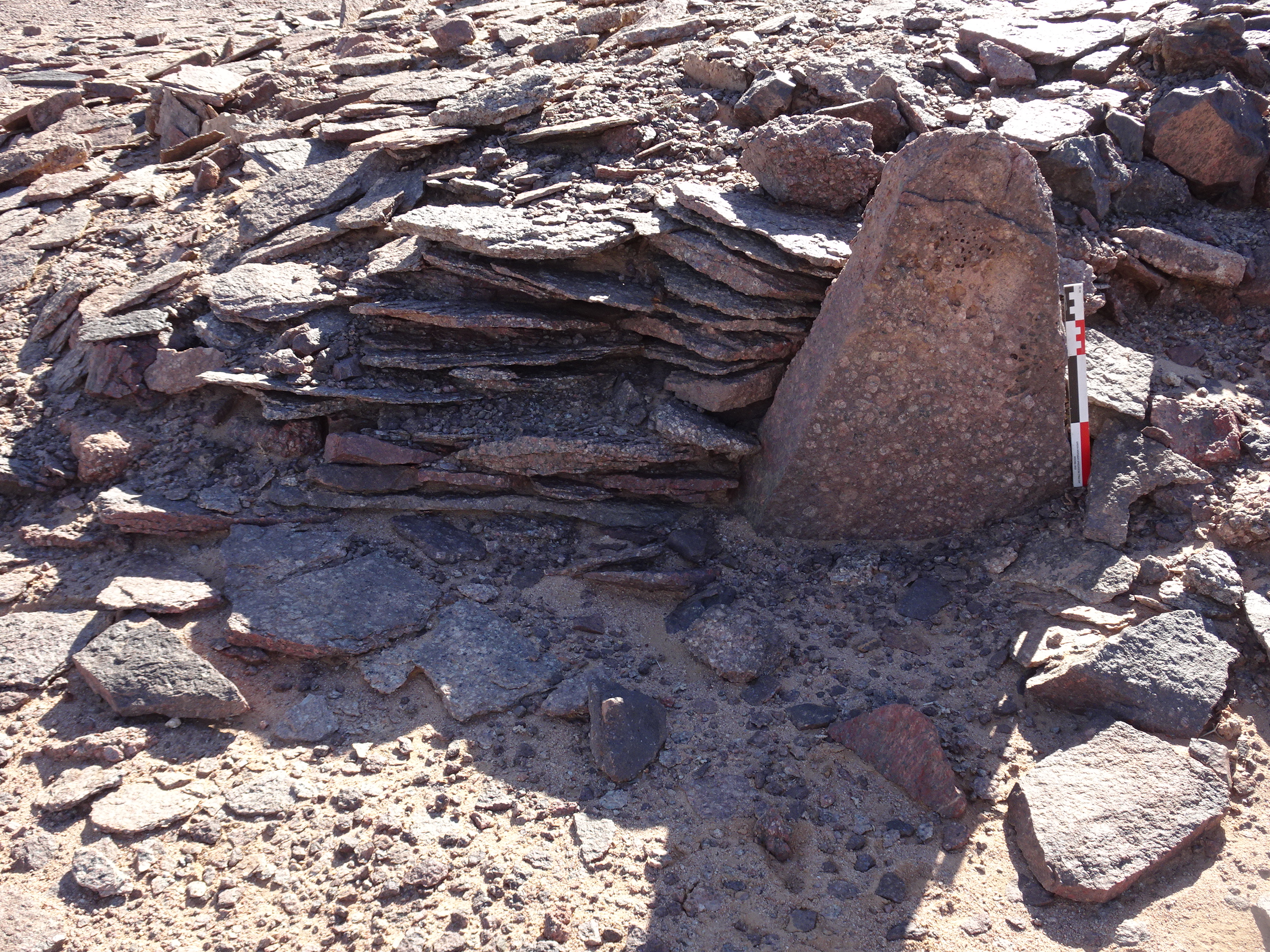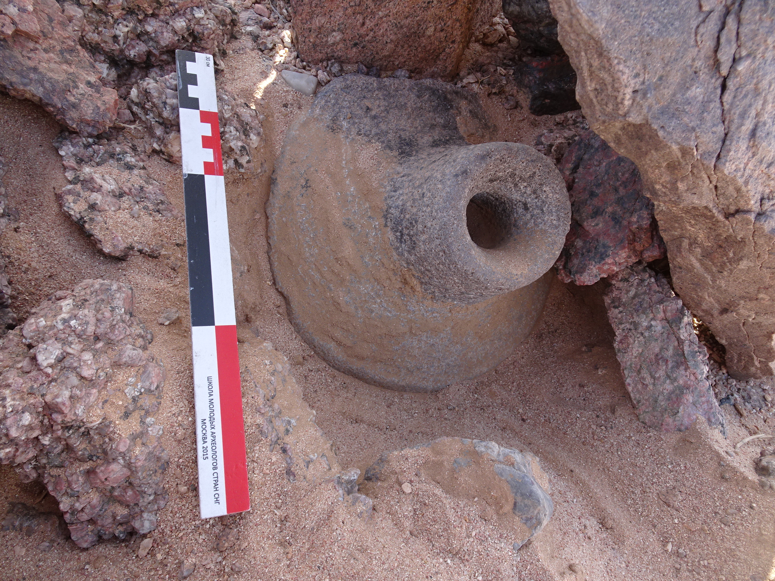 Вид с С на жернов в кладке кур. 1 могильника Бир Могрейн 9