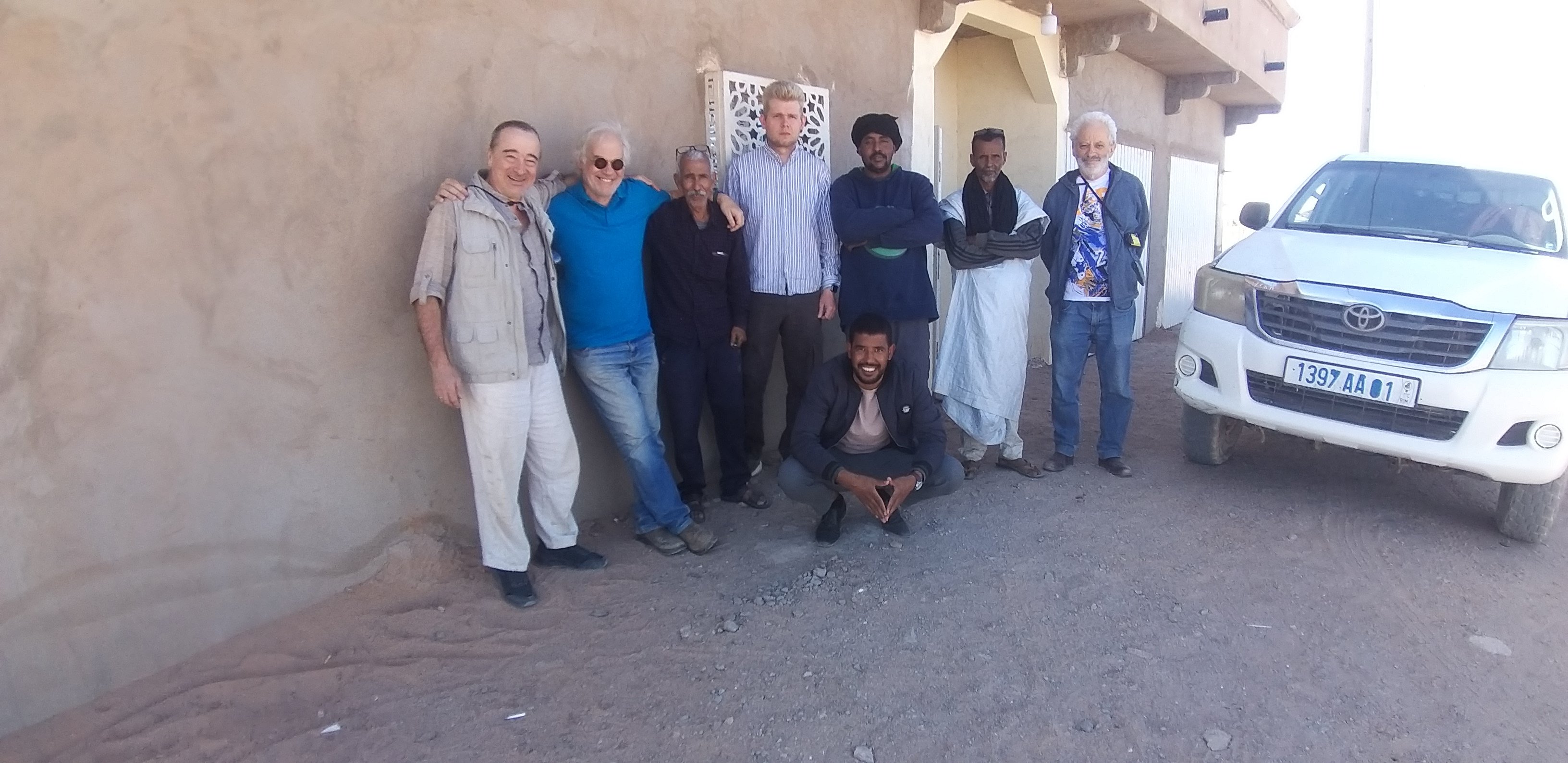 Участники археологической разведки в окрестностях Бир Могрейна в 2026 г. Стоят слева направо: Д.С. Коробов (археолог ИА РАН, Россия), Масиель Сантош (историк Ун-т Порто, Португалия), Зуено Мохаммед Саид (проводник, горный инженер, Западная Сахара), Е.В. Суханов (археолог ИА РАН, Россия), Мохаммед (водитель, ИРМ), Хасан (водитель, ИРМ), Аугушто Ланса (этноботаник Ун-т Бежа, Португалия); сидит: Манфуд мед Лемме (инспектор МЭР, ИРМ)