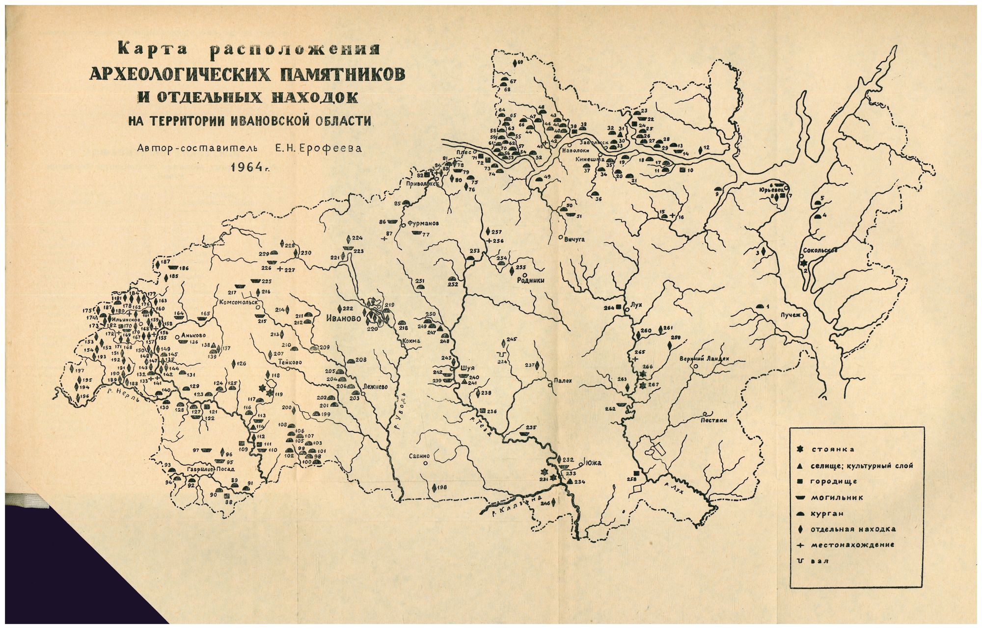 Рис. 3. Карта археологических памятников Ивановской области [Ерофеева, 1965. Рис. 1]