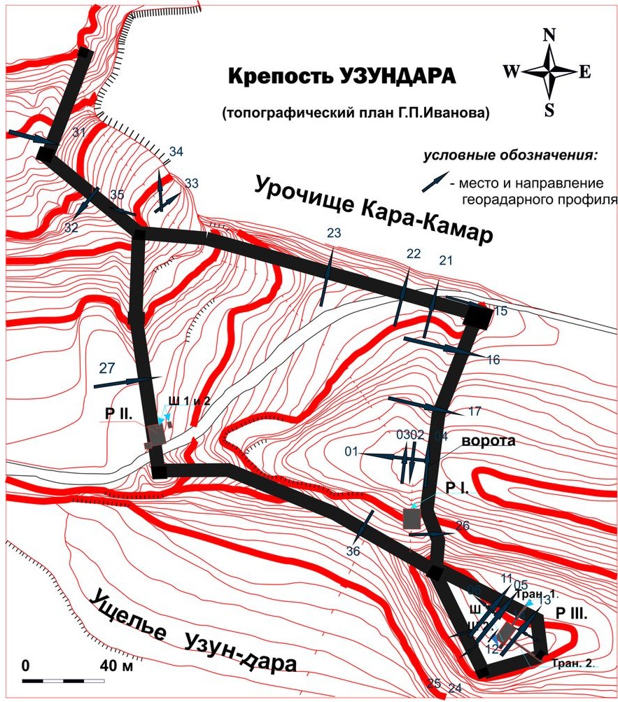 Рис. 1. Топографический план крепости Узундара с указанием месторасположения археологических раскопов и места сканирования георадарных профилей