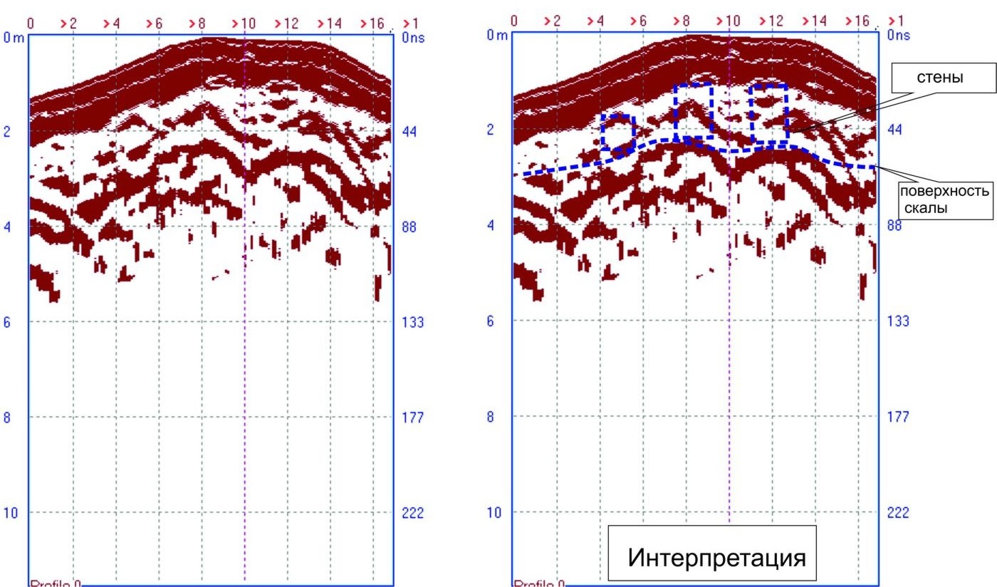 Рис. 5. Георадарный профиль 21, прорезающий северную крепостную стену (слева), и его интерпретация (справа)