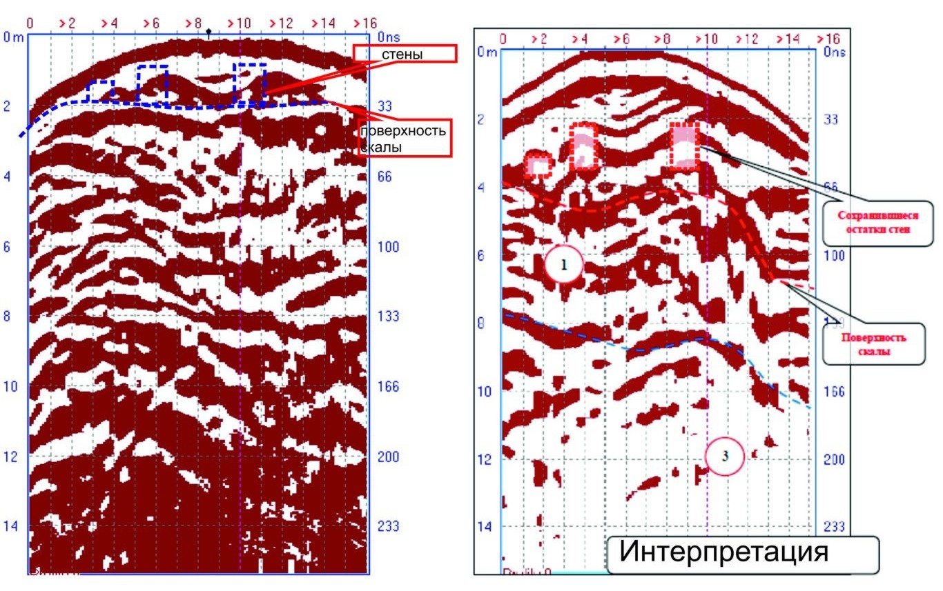 Рис. 6. Георадарные профили 33 (слева) и 36 (справа), прорезающие северную и южную крепостные стены