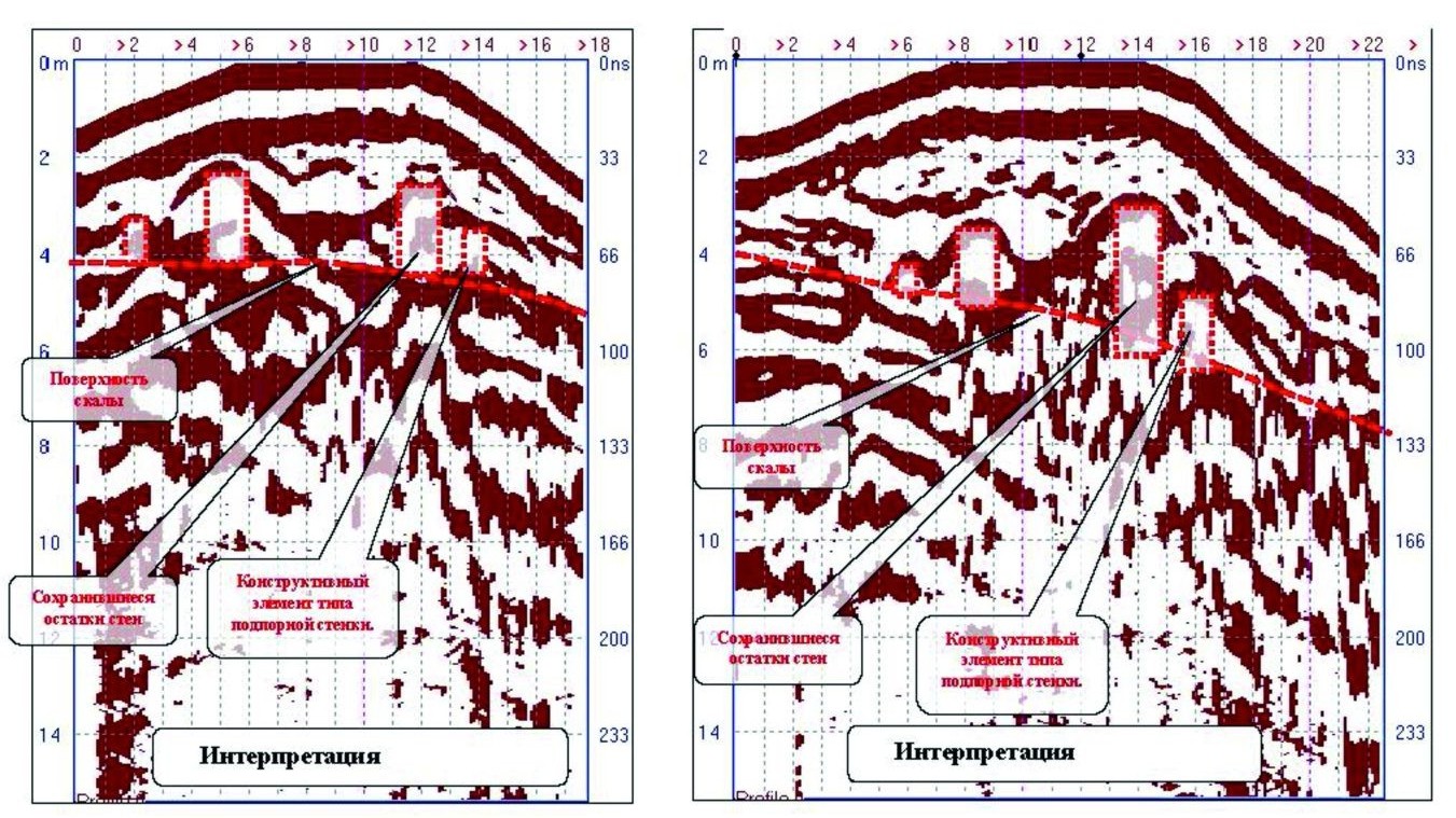 Рис. 7. Георадарные профили 16 (слева) и 17 (справа), прорезающие восточную крепостную стену