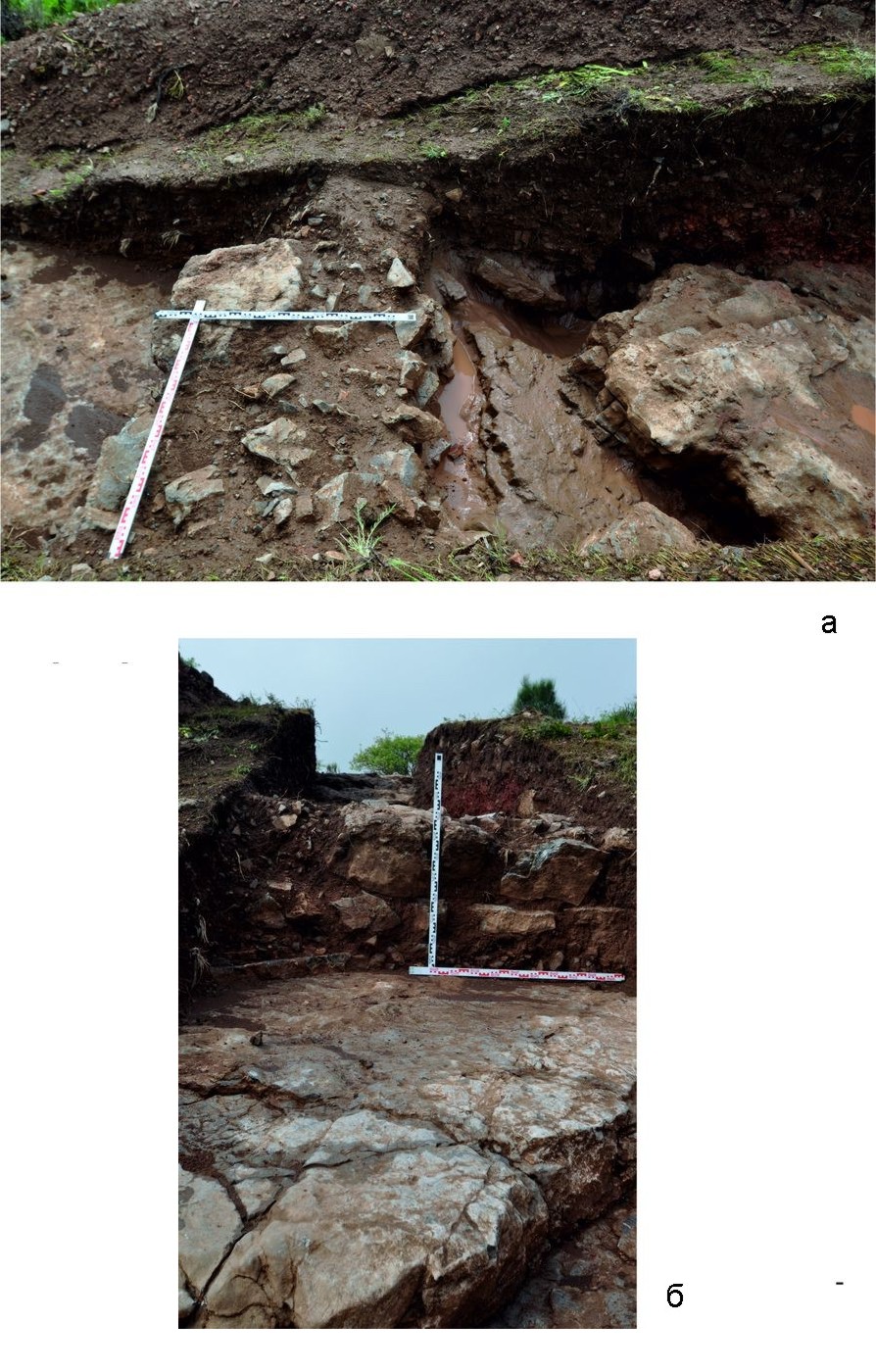 Рис. 11. Крепость Узундара 2014. Цитадель. Раскоп III. Скальный комплекс. Траншея 1. Северная крепостная стена: вид с северо-запада (а) и с северо-востока (б)