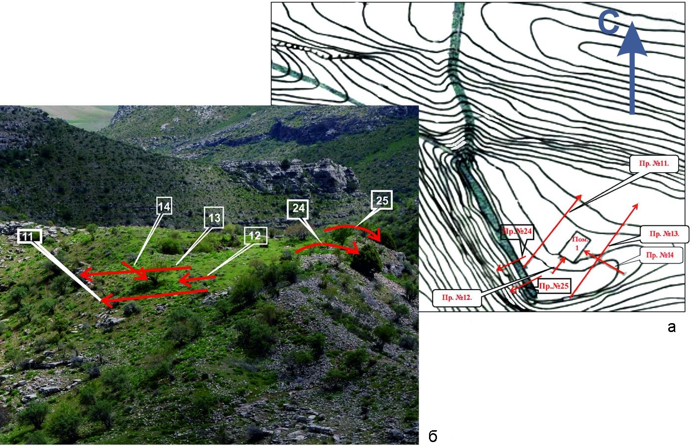 Рис. 12. Место расположения серии георадарных профилей № 11-14 в районе Раскопа III на цитадели крепости Узундара: а - топографический план; б - вид с северо-запада