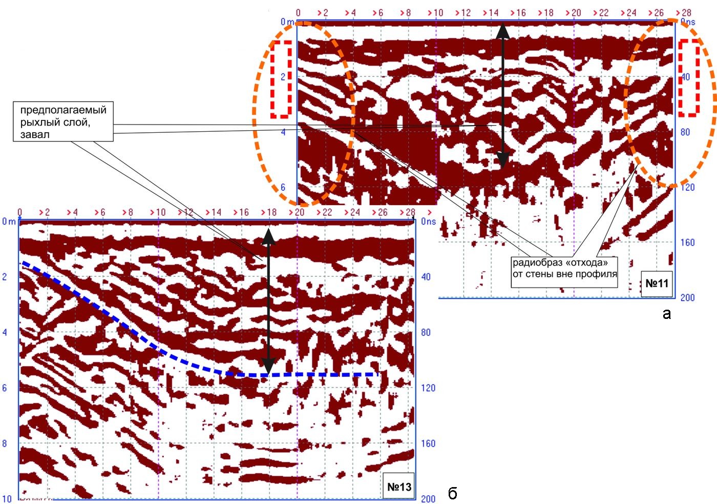 Рис. 13. Георадарные профили 11 (а) и 13 (б), расположенные на цитадели в районе Раскопа III