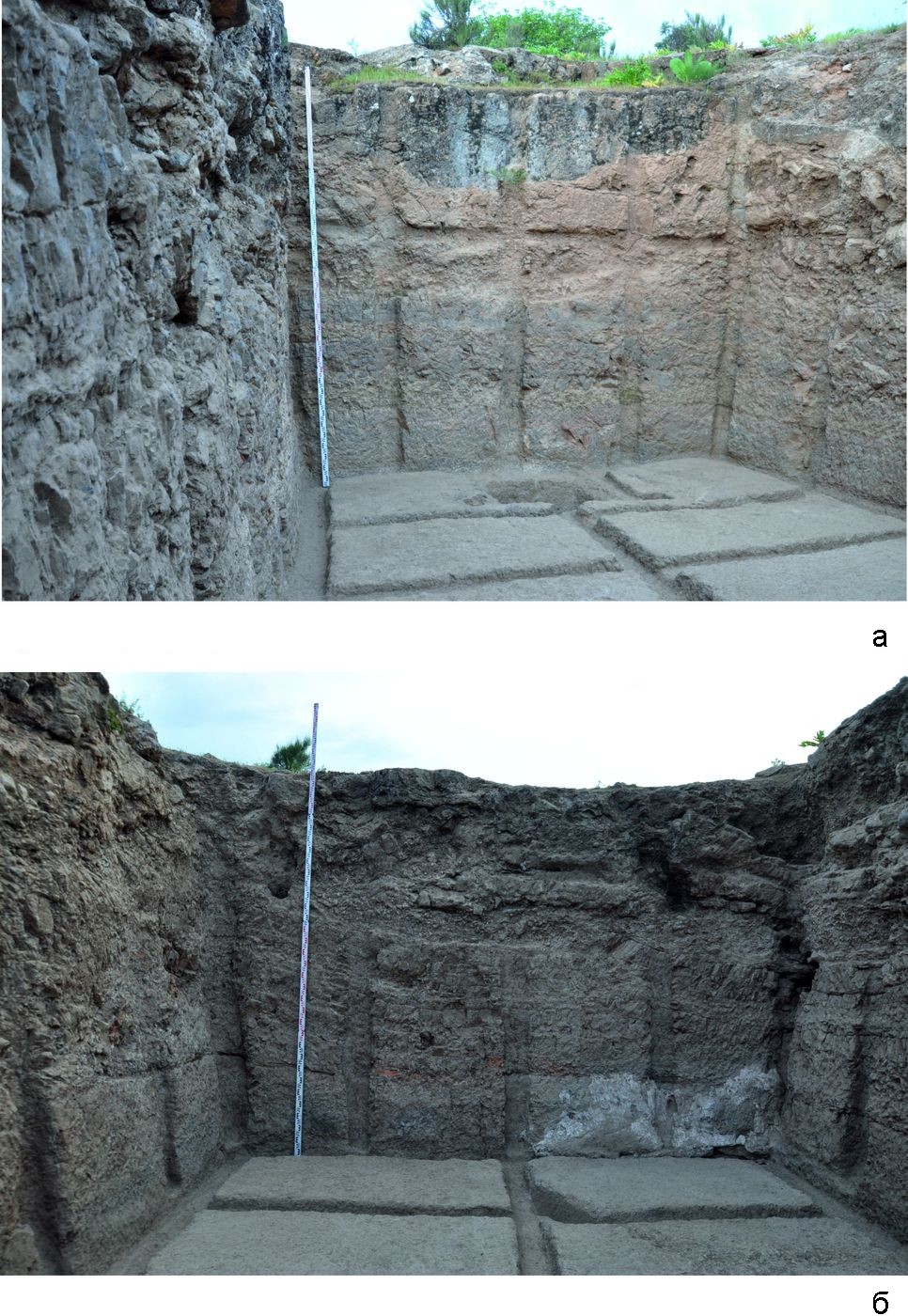 Рис. 16. Раскоп III. Помещение 1. Северная (а) и южная (б) стены помещения