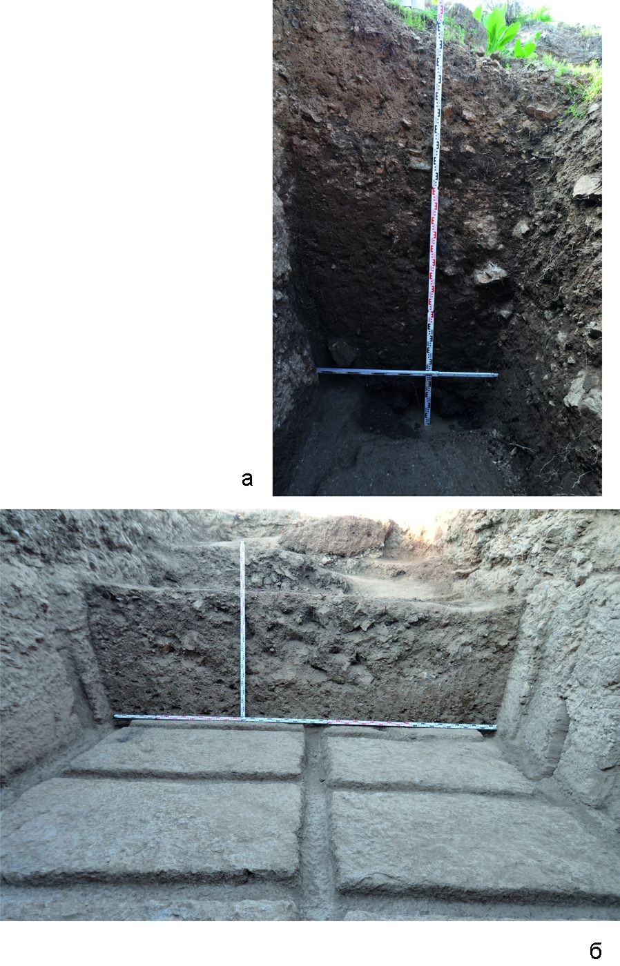 Рис. 17. Раскоп III. Помещение 1. Стратиграфия заполнения: а - западный профиль шурфа 1, вид с востока; б - северный борт разреза, вид с юга