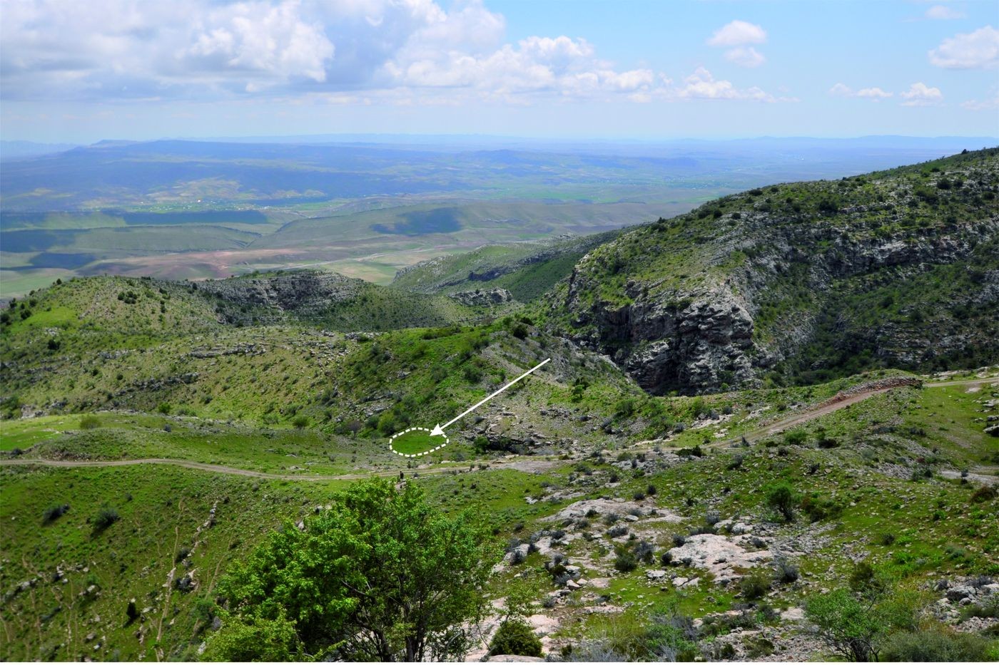 Рис. 19. Крепость Узундара, фото 2013 г. Нижняя площадка у западной крепостной стены. Место наибольшей концентрации воды. Вид с северо-запада с верхней башни