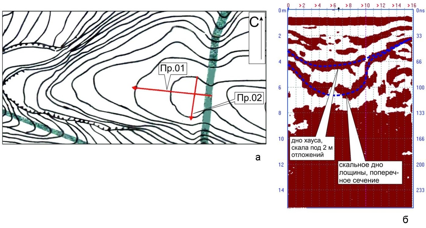 Рис. 20. Георадарные профили 01 и 02, расположенные в районе предполагаемого хауза: а - расположение профилей; б - георадарный профиль 02