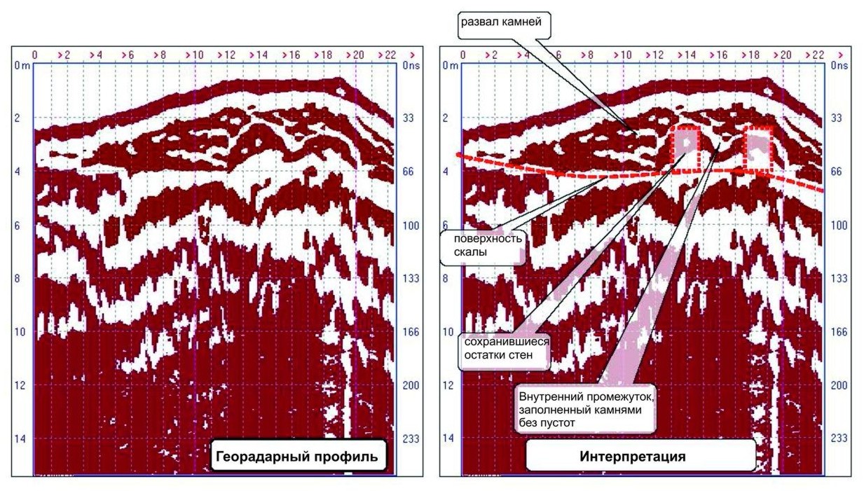 Рис. 23. Георадарный профиль 15, прорезающий северо-восточную угловую башню (слева), и его интерпретация (справа)