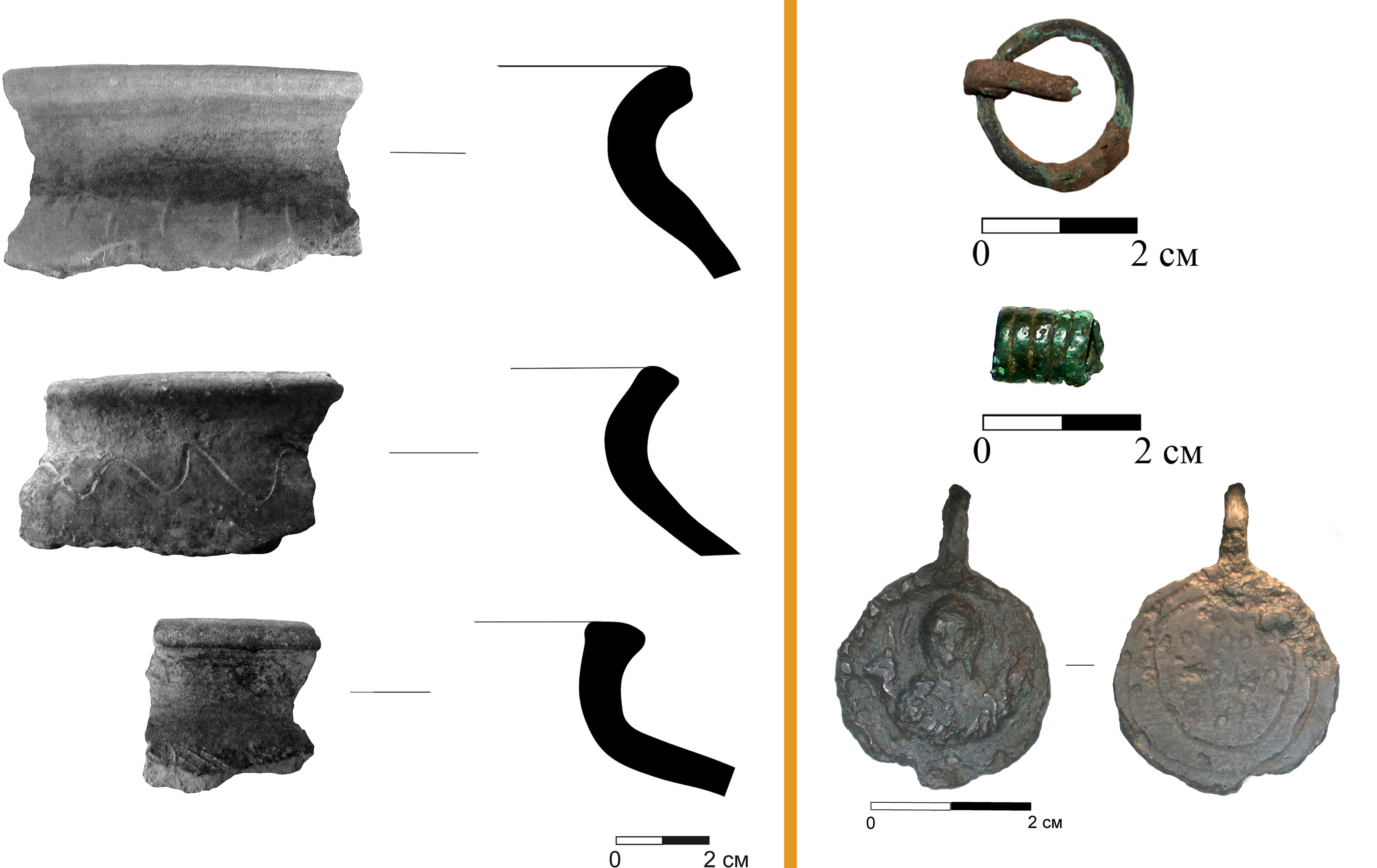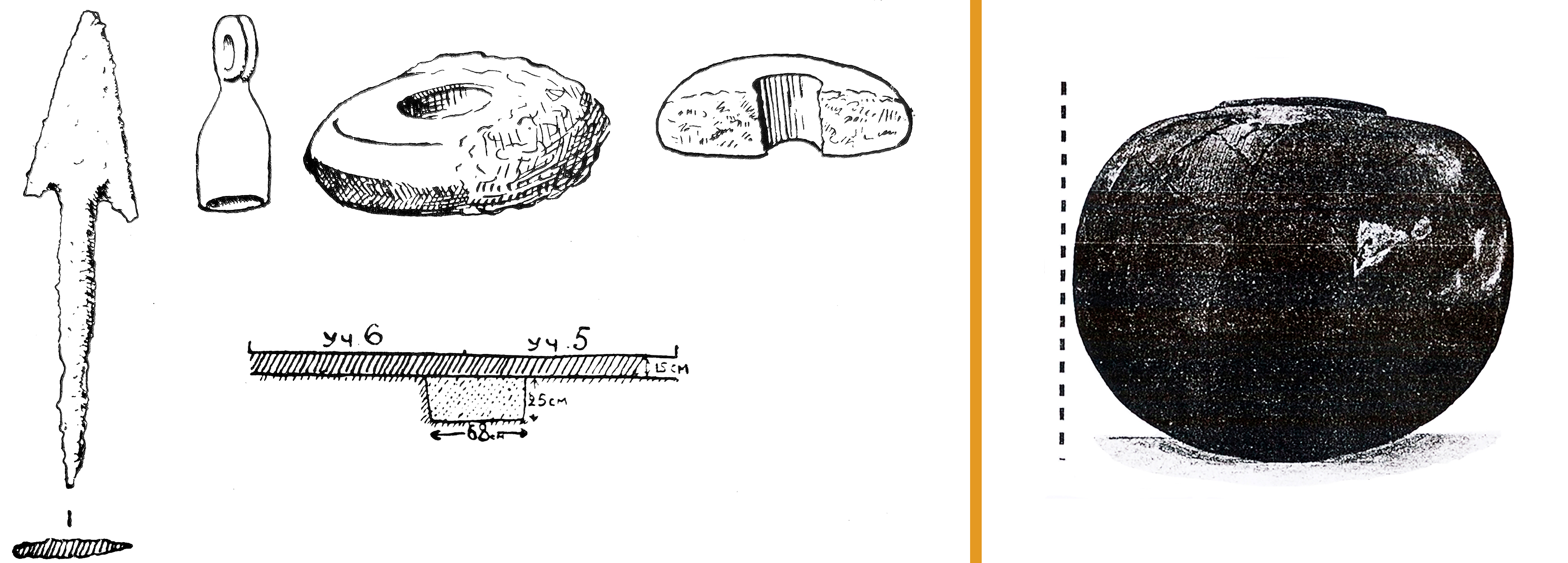 Находки на городище Пушкариха. Железный наконечник стрелы; бронзовая финская привеска; глиняные пряслица; план могильной ямы