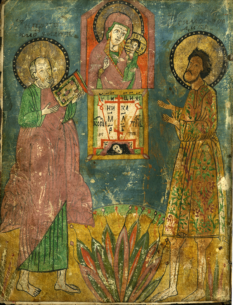 Святые Симон Зилот и Симон Юродивый в молении образу Богоматери Одигитрии. Миниатюра рукописи. Первая треть XVIII в. ОР РНБ
