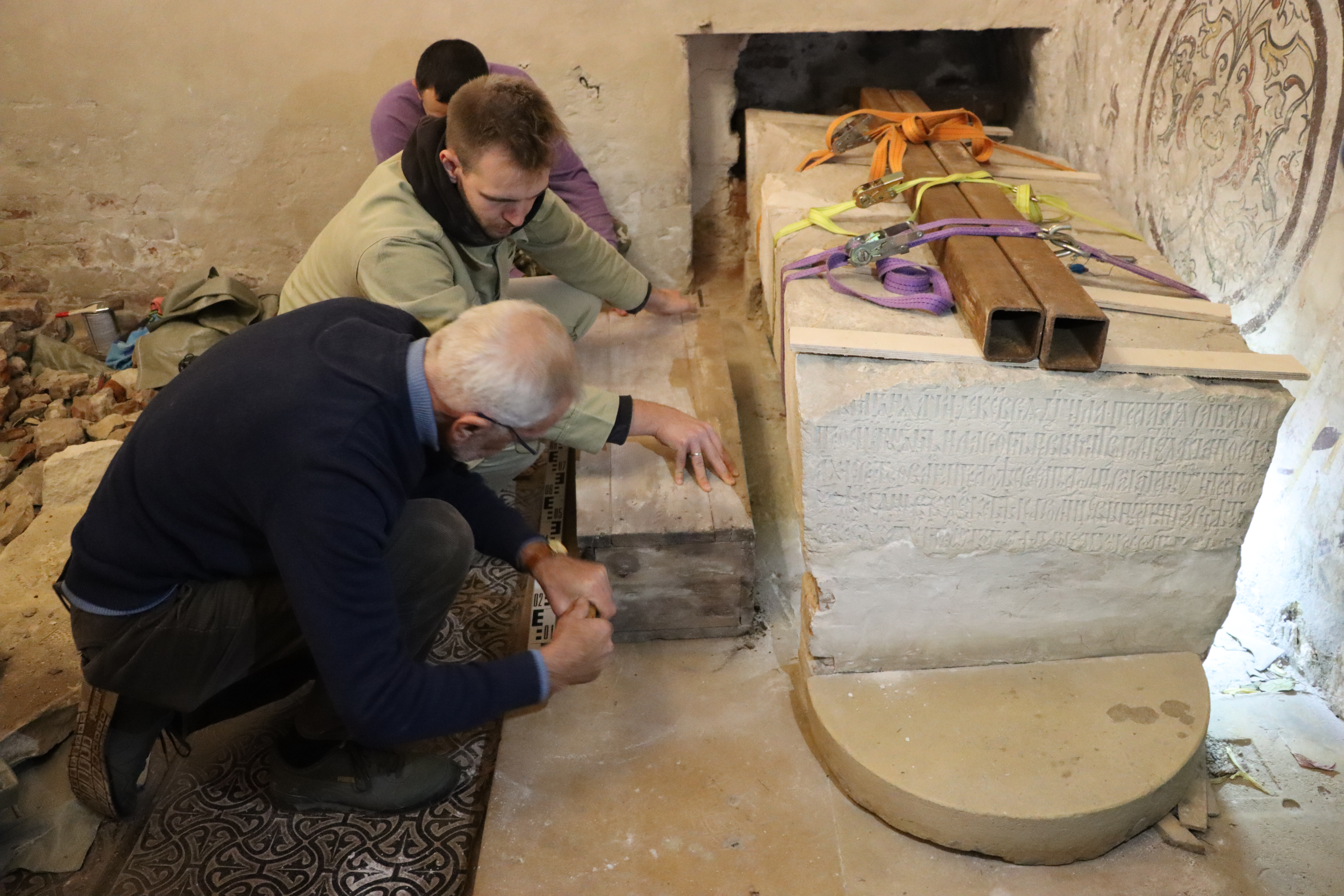 Вскрытие реставраторами извлеченного из-под плиты гроба с останками митрополита Иллариона 16 октября 2024 г.