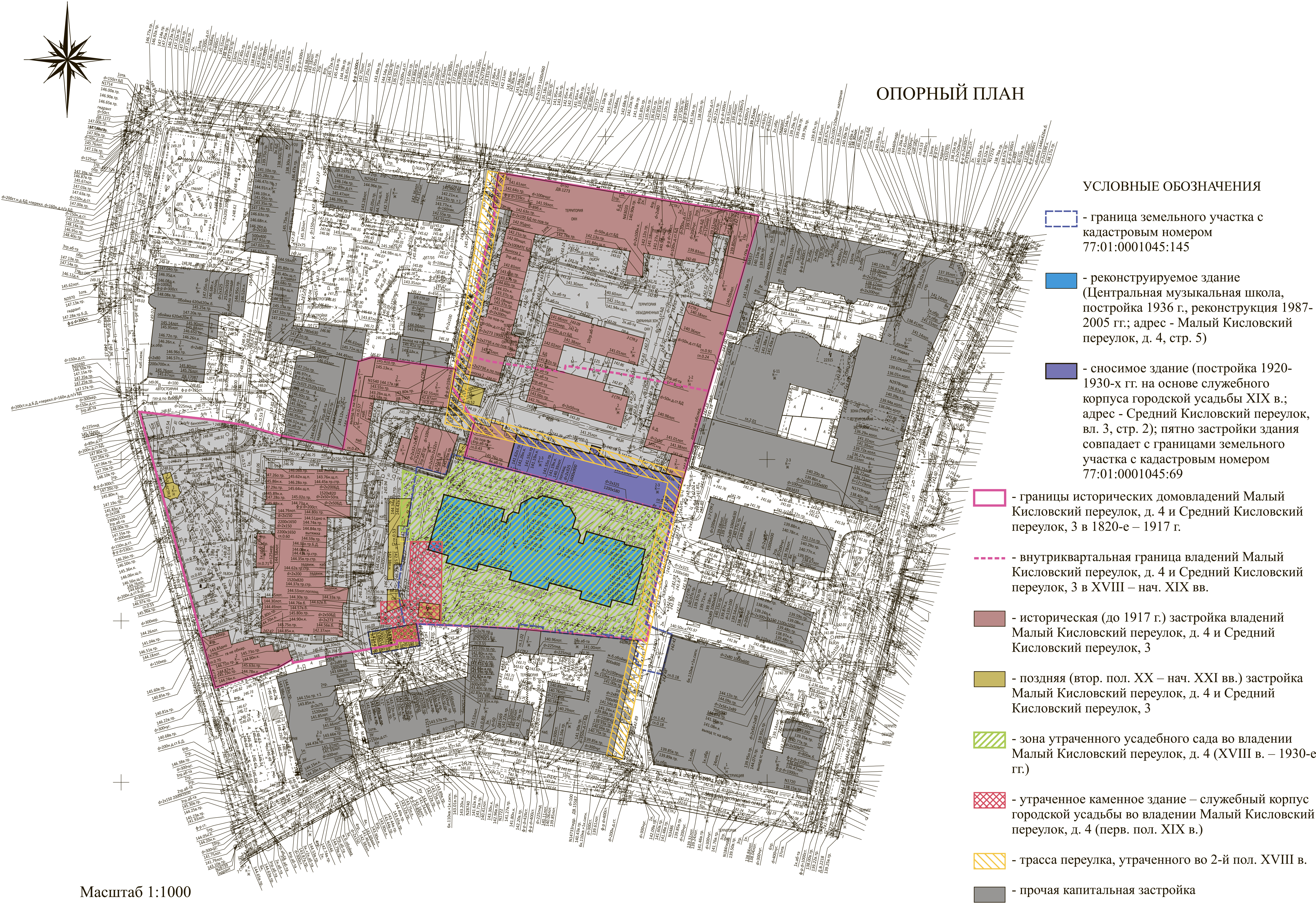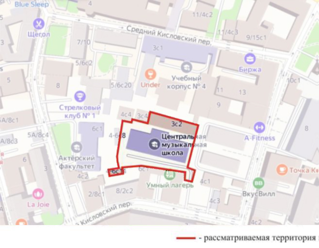 Рассматриваемая территория находится в глубине квартала, ограниченного Кисловскими переулками: Большим, Нижним, Малым и Средним. Она включает внутриквартальные участки двух исторических домовладений: Средний Кисловский пер., 3 (сносимое здание – стр. 2) и Малый Кисловский пер., 4, 6 (реконструируемое здание – Малый Кисловский пер., 4, стр. 5).