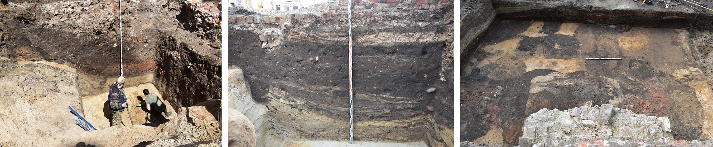 Слева: зачистка погреба XVII в. В середине: разрез погреба XVII в. Справа: поверхность материка с пятнами ям XVI–XIX вв.