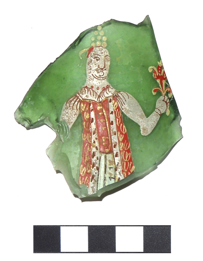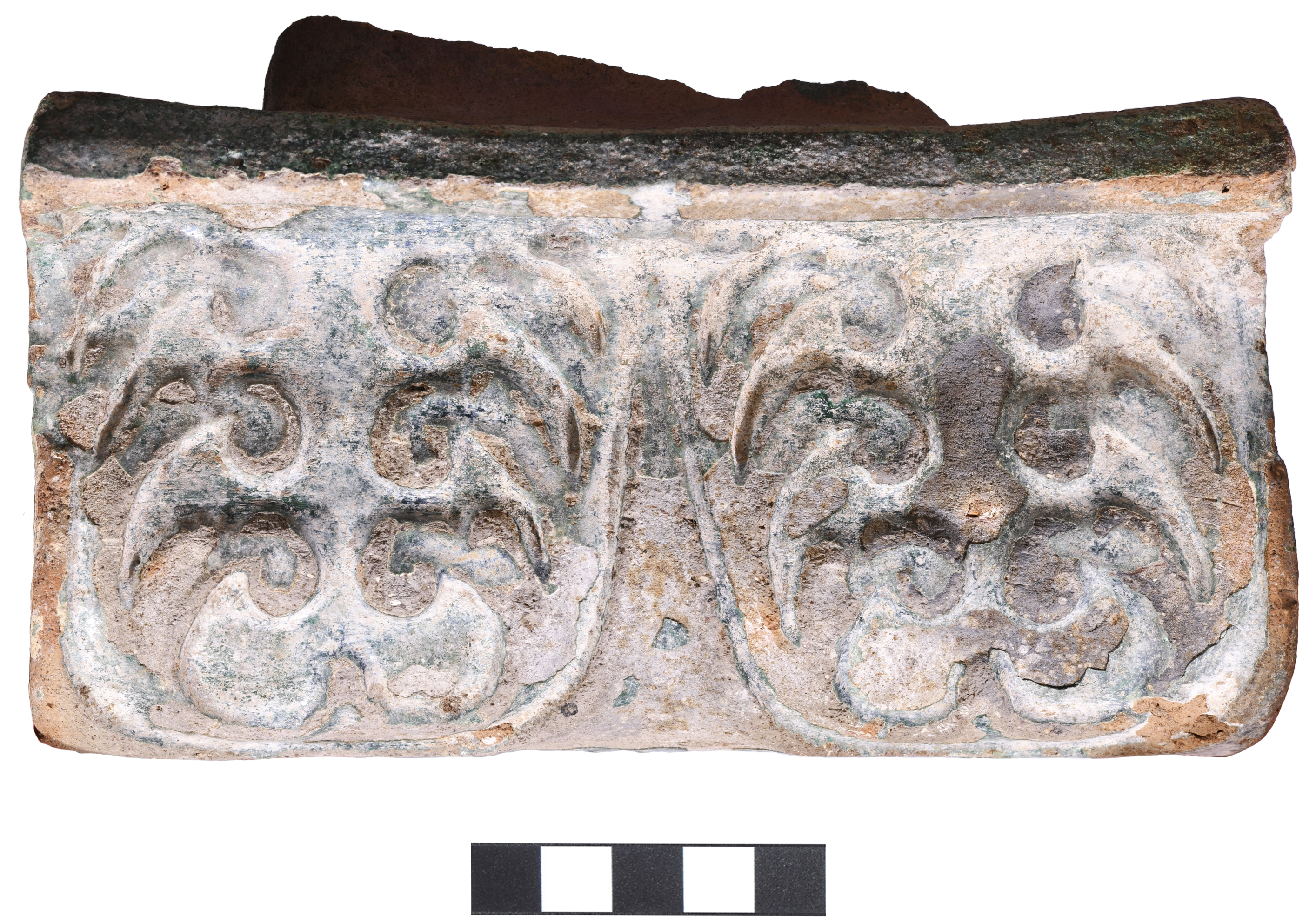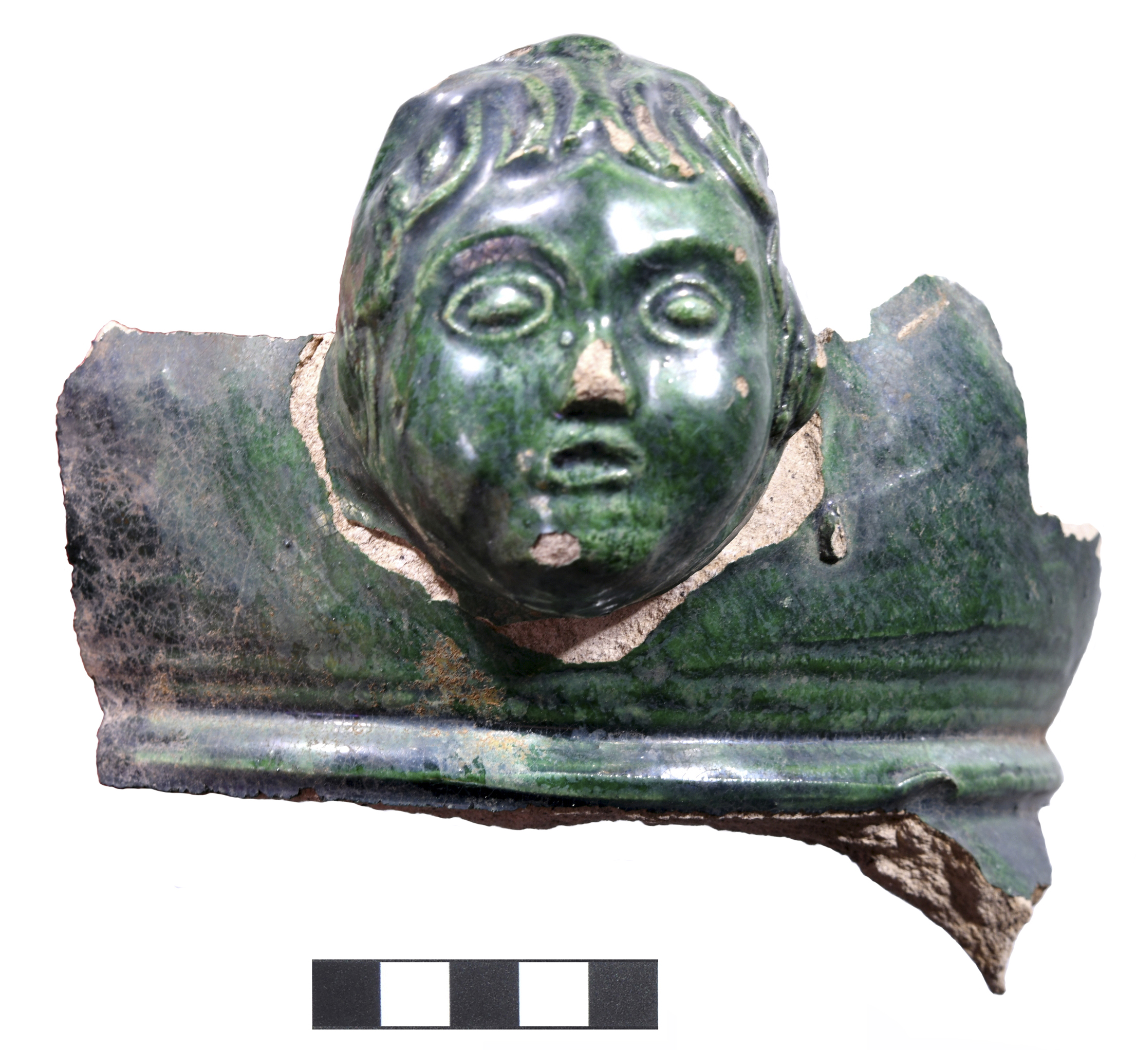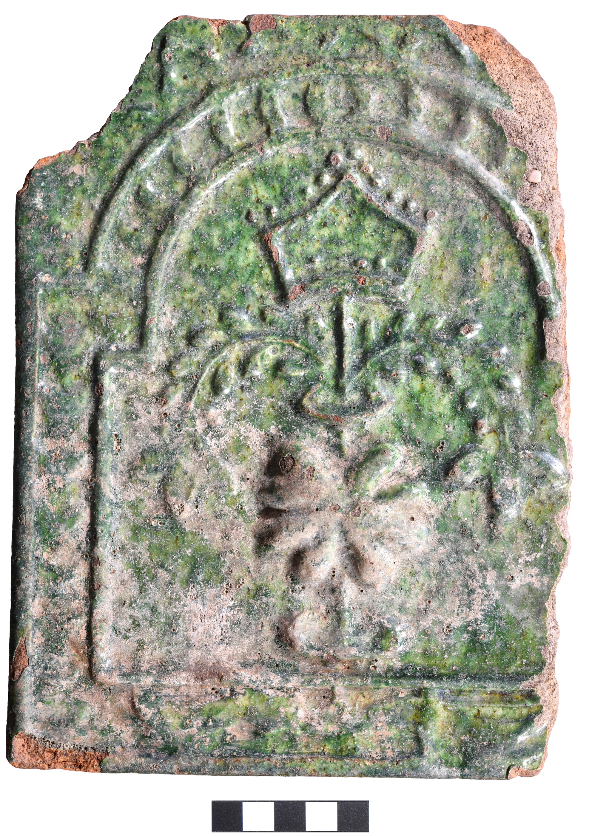 Весьма необычная находка – часть крупного керамического предмета, покрытого глазурью. На поверхности, под зеленью глазури, вытеснены рельефные украшения: растительный орнамент и небольшие головки-маскароны. Функция предмета неясна – вероятно, это часть опоры, церковный светильник или литургического устройства, – тощей свечи, подставки для аналоя или креста.