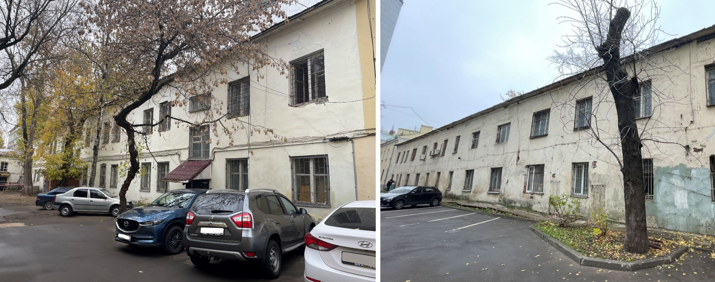 Слева: сносимое здание. Вид с северо-запада (главный фасад со стороны внутреннего двора владения Средний Кисловский пер., 3). Фото 2022 г.