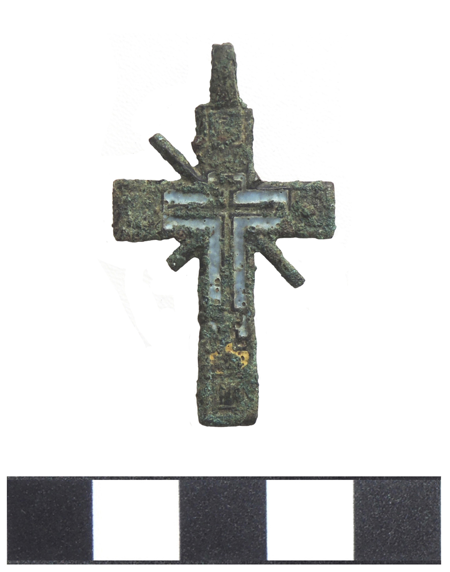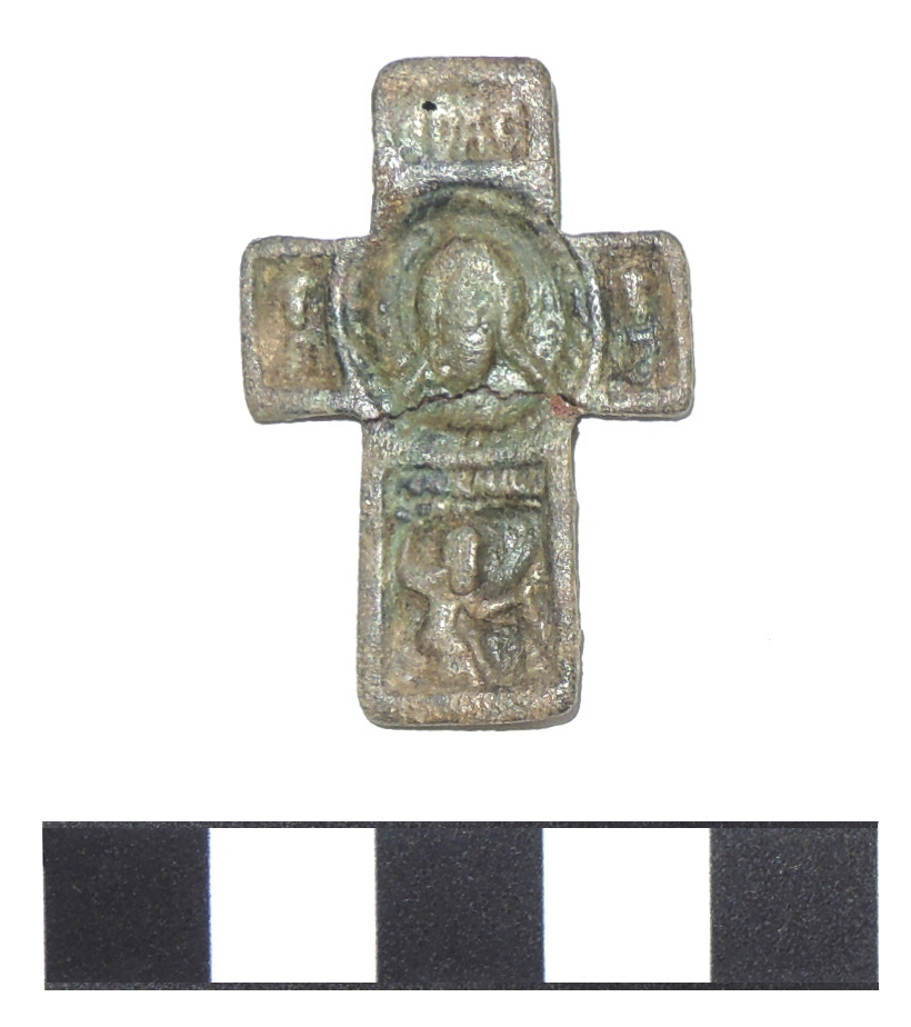Среди предметов медной пластики привлекает внимание небольшой подвесной («тельный») крест с изображениями Спаса Нерукотворного в средокрестии и исключительно почитавшегося в Москве святого, Никиты Бесогона – в изножии.