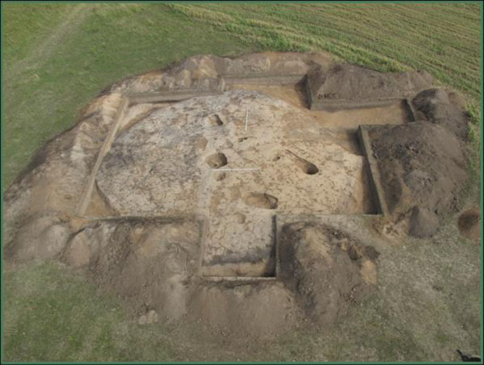 Летом 2011 г. Суздальской экспедицией Института археологии были открыты и исследованы остатки одной из курганных насыпей средневекового могильника у с. Шекшово в Суздальском Ополье. Курганный могильник в окрестностях с. Шекшово известен как один из крупнейших в центре Суздальской земли: в 1852 г. А.С.Уваровым здесь было раскопано 244 насыпи. Следов курганов в настоящее время не сохранилось, однако, зная расположение поселений, мы смогли локализовать примерное место могильника и выявить в одном из раскопов ровик, окружавший округлую в плане площадку размерами 17 х 18 м, на которой, по-видимому, находилась курганная насыпь. В центре площадки на уровне древней дневной поверхности расчищен боевой топор со следами серебряной инкрустации, сильно поврежденный коррозией, и серебряная подковообразная фибула с позолотой. Очевидно, эти вещи сопровождали мужское погребение, костные остатки которого не сохранились. Значение находки для изучения ранней истории Северо-Восточной Руси удалось в полной мере оценить после завершения реставрации топора, произведенной в лаборатории Государственного исторического музея В.А. Ширяковым. Под слоем коррозии выявился не только орнамент, но и тамгообразные княжеские знаки («знаки Рюриковичей»), прежде никогда не встречавшиеся на подобных предметах.