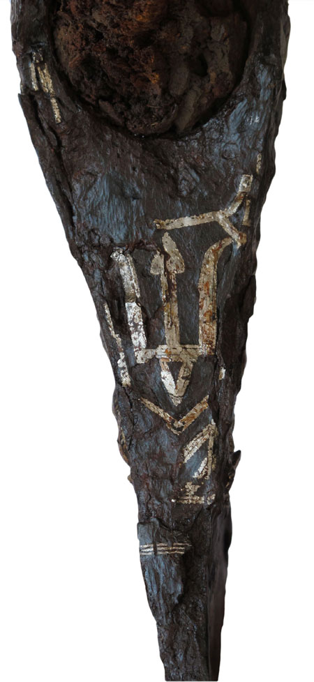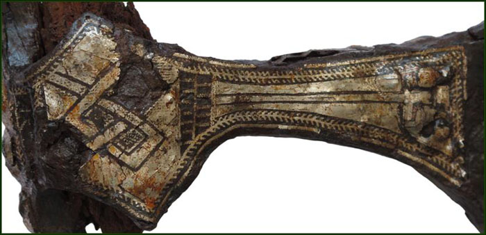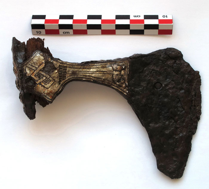 Топорик (вес около 240 г., длина лезвия 13, 5 см, ширина – 9,4 см) принадлежит к широко известному типу «топоров с вырезным обухом», вошедшему в обиход в X в. и получившему широкое распространение в XI-XII вв. От стандартных топориков этого типа он отличается серебряным декором, покрывающим шейку и обух, на торцевой части обуха орнамент выполнен инкрустацией серебра по железу, на боковых гранях – плакировкой (на железо наложена серебряная пластина, на которой заранее был прорезан рисунок). Помимо орнаментальных фигур, на одной из боковых граней топора помещено изображение прямоконечного креста с длинной нижней лопастью, на другой – изображение двузубца с треугольным выступом в основании и отогнутыми наружу зубцами (общий родовой знак Рюрикова дома), на торцевой части шейки – изображение трезубца с треугольником в основании – тамгообразный знак, близкий знакам князей Владимира Святославича и Ярослава Владимировича. Трезубец, как и двузубец на боковой грани, имеют четкие очертания, это ясно узнаваемые знаки, а не орнаментальные фигуры.