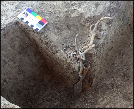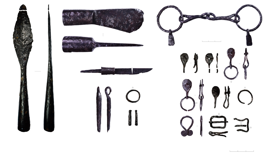 Основными составляющими «оружейных комплексов» были наконечники колющего оружия (копий и дротиков), воткнутые остриями вниз. Они присутствовали в восьми комплексах. Кельты и проушные топоры найдены в семи. В составе ряда наборов имелись ножи и фитильные трубки, удила, металлические детали узды и плети, пряжки от упряжи. Три находки представляли собой одиночные предметы – копья и топор, кельт, четыре комплекса включали наборы из трех или четырех предметов, с присутствием колющего оружия, топоров и ножей с обоймицей или удил. Два комплекса выделялись многочисленностью предметов вооружения и всаднического снаряжения. Создается впечатление, что наконечники копий, топоры и ножи втыкались непосредственно в грунт, а всадническое снаряжение помещались в вертикальном положении в узкие ямы, прорезанные этими предметами. Обряд не предполагал совместного помещения оружия и всаднического снаряжения и человеческих останков. Разрозненные единичные кальцинированные кости собраны в частично сохранившемся гумусированном грунте.