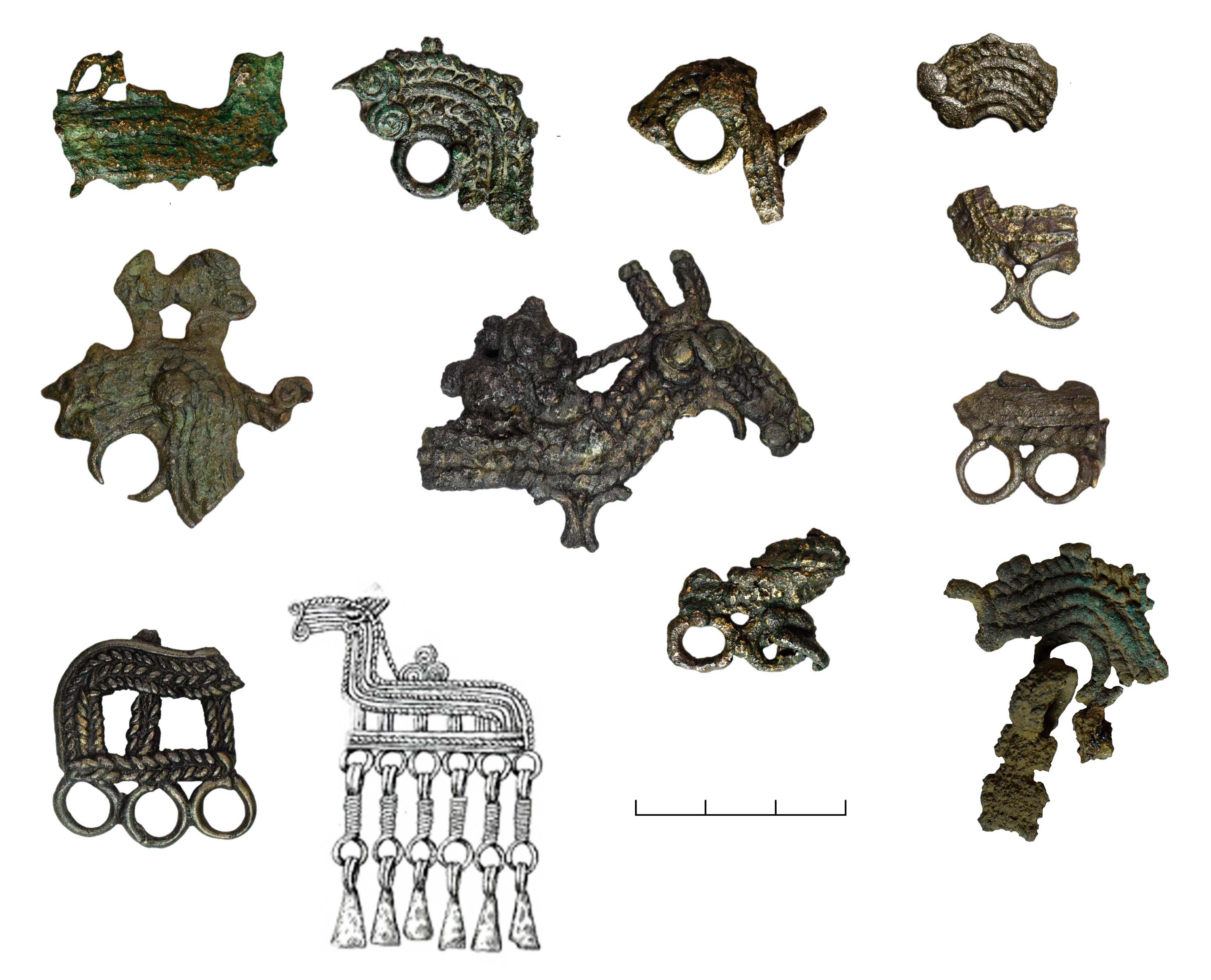 Среди предметов из цветного металла, собранных на площадке могильника, наиболее многочисленные категории украшений – шумящие подвески (в том числе коньки «владимирского типа», треугольные каркасные и планки из трех «жемчужин»), привески и бубенчики, фрагменты шейных гривен, браслеты и перстни. Заметную группу составляют ременные накладки, наконечники и пряжки. Небольшими сериями или единичными находками представлены подковообразные фибулы, литые пуговицы, обломки бусинных височных колец. Единственный христианский предмет – створка энколпиона с черненым изображением Богоматери. Основная часть металлических украшений датируется в широких хронологических рамках IX–X вв. При этом в коллекции выделяется выразительная группа вещей, верхняя граница бытования которых не выходит за пределы VIII в. Это, прежде всего детали неволинской поясной гарнитуры: ременные накладки и наконечники, первоначальное происхождение которых связано с Прикамьем. Установлено, что эти престижные элементы костюма в VIII в. были знакомы населению восточного побережья Балтийского моря, Среднего Поволжья и Поочья. Накладки из Шелебова – первая находка неволинской ременной гарнитуры в Суздальском Ополье.