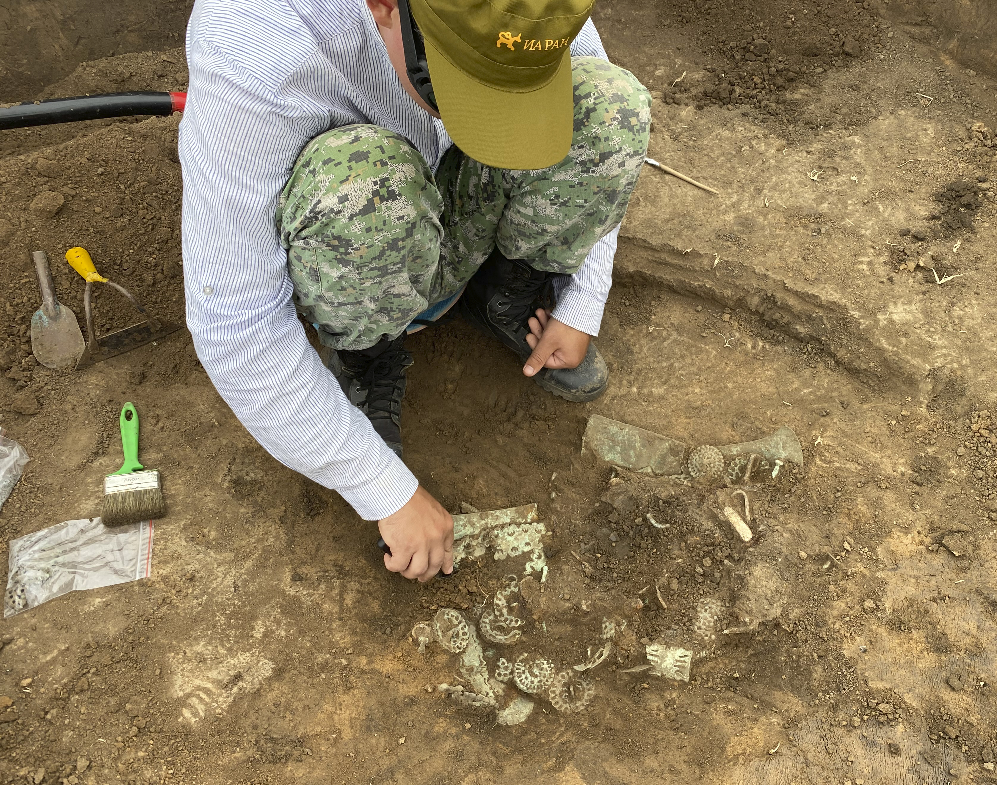 Летом 2025 г. Приуральской экспедицией ИА РАН (рук. Богачук Д.С., Сиротин С.В.) были продолжены работы на курганном некрополе «Высокая Могила – Студеникин Мар» в Оренбургской области. В состав некрополя входят пять курганных групп, вытянутых неправильной цепочкой протяженностью более 6 км в широтном направлении. Исследования проводились в центральной части могильника, на объектах группы «Высокая Могила». В ходе работ был исследован курган 19 (диаметр 26 м, высота 0,4–0,5 м), в центре которого обнаружена яма, оказавшаяся на момент исследования пустой. Помимо этого, проводилось обследование межкурганного пространства около кургана 1 группы 1 «Высокая Могила» (диаметр 140 м, высота более 7 м). К востоку от насыпи кургана, в пахотном слое найдены железные удила, псалии, налобник с крючковидным навершием, которые были растащены при пахотных работах и, вероятнее всего, относились к жертвенным комплексам. К востоку и юго-востоку от насыпи найдены серебряная оковка деревянного сосуда, золотая нашивная бляшка с изображением головы и передней лапы тигра. Основная часть находок локализована на расстоянии 20–50 м от полы кургана.