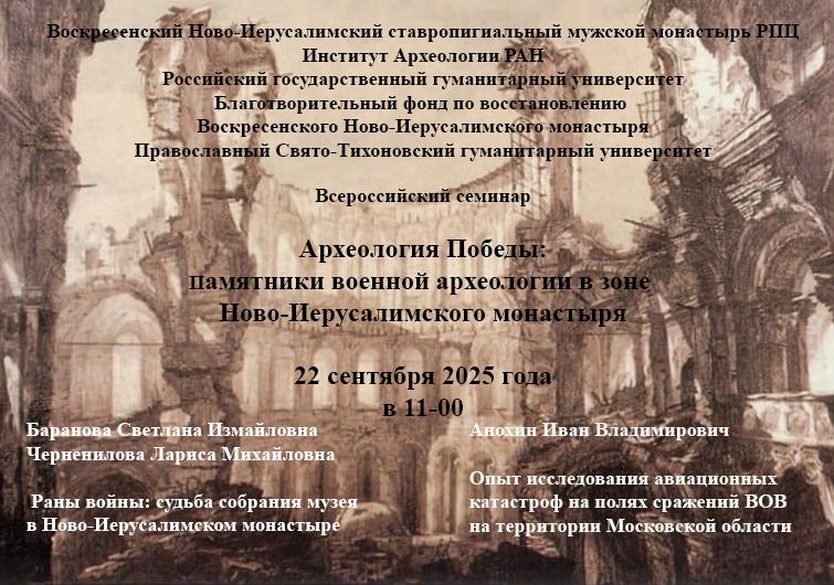22 сентября 2025 г. в 11:00 состоится второй Всероссийский семинар «Археология Победы: памятники военной археологии в зоне Ново-Иерусалимского монастыря». Семинар будет проводиться в очномформате на территории Воскресенского Ново-Иерусалимского ставропигиального мужского монастыря (г. Истра). Семинар приурочен к 80-летию празднования Победы в Великой Отечественной войне.