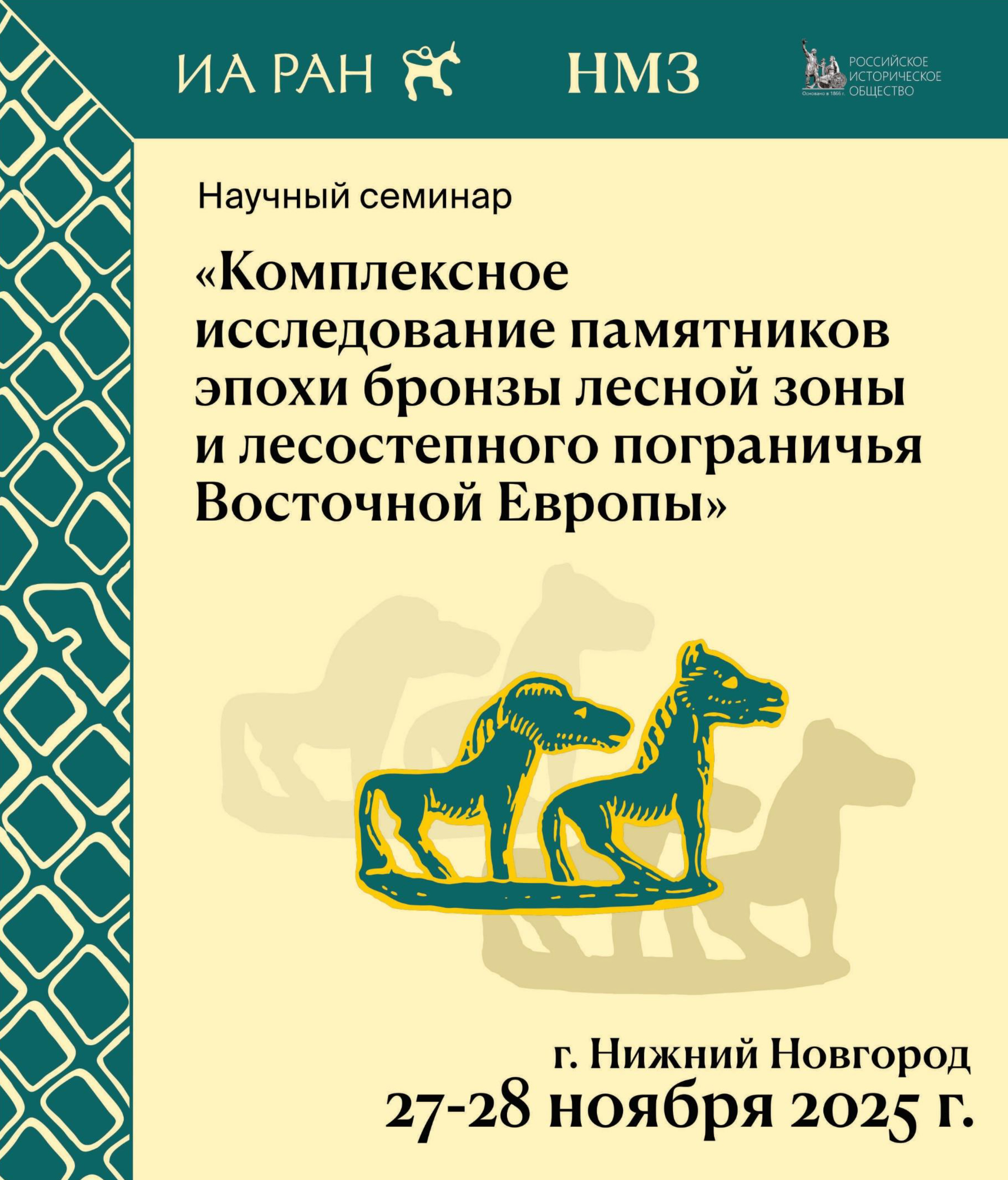 27–28 ноября 2025 г. в Нижнем Новгороде состоится научный археологический семинар «Комплексное исследование памятников эпохи бронзы лесной зоны и лесостепного пограничья Восточной Европы». Организаторы мероприятия – Институт археологии РАН и Нижегородский государственный историко-архитектурный музей-заповедник.