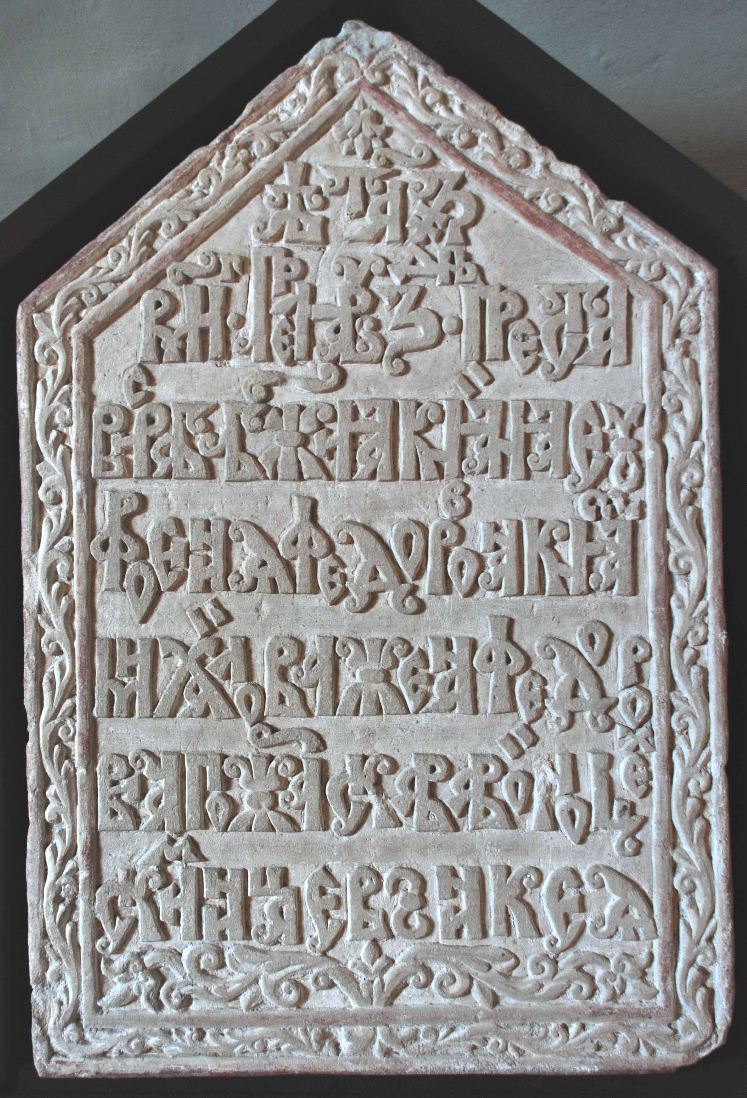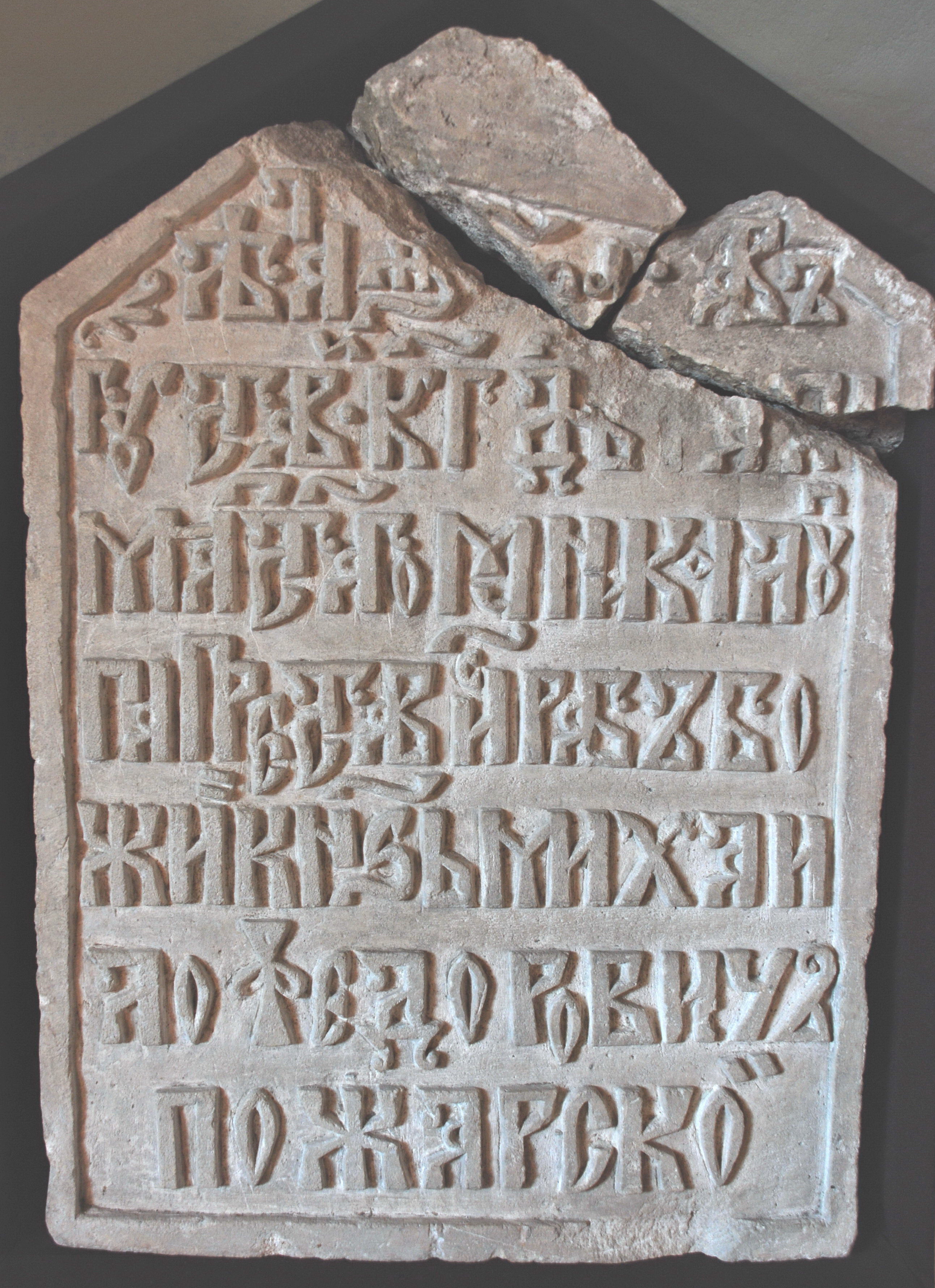 Резные надписи с надгробниц родителей князя Д.М.Пожарского - Михаила Федоровича (1587) и Ефросиньи (Марии) Федоровны (1640), найденные при реставрационных работах в Спасо-Евфимиевом монастыре. Иллюстрация из доклада Л.А. Беляева