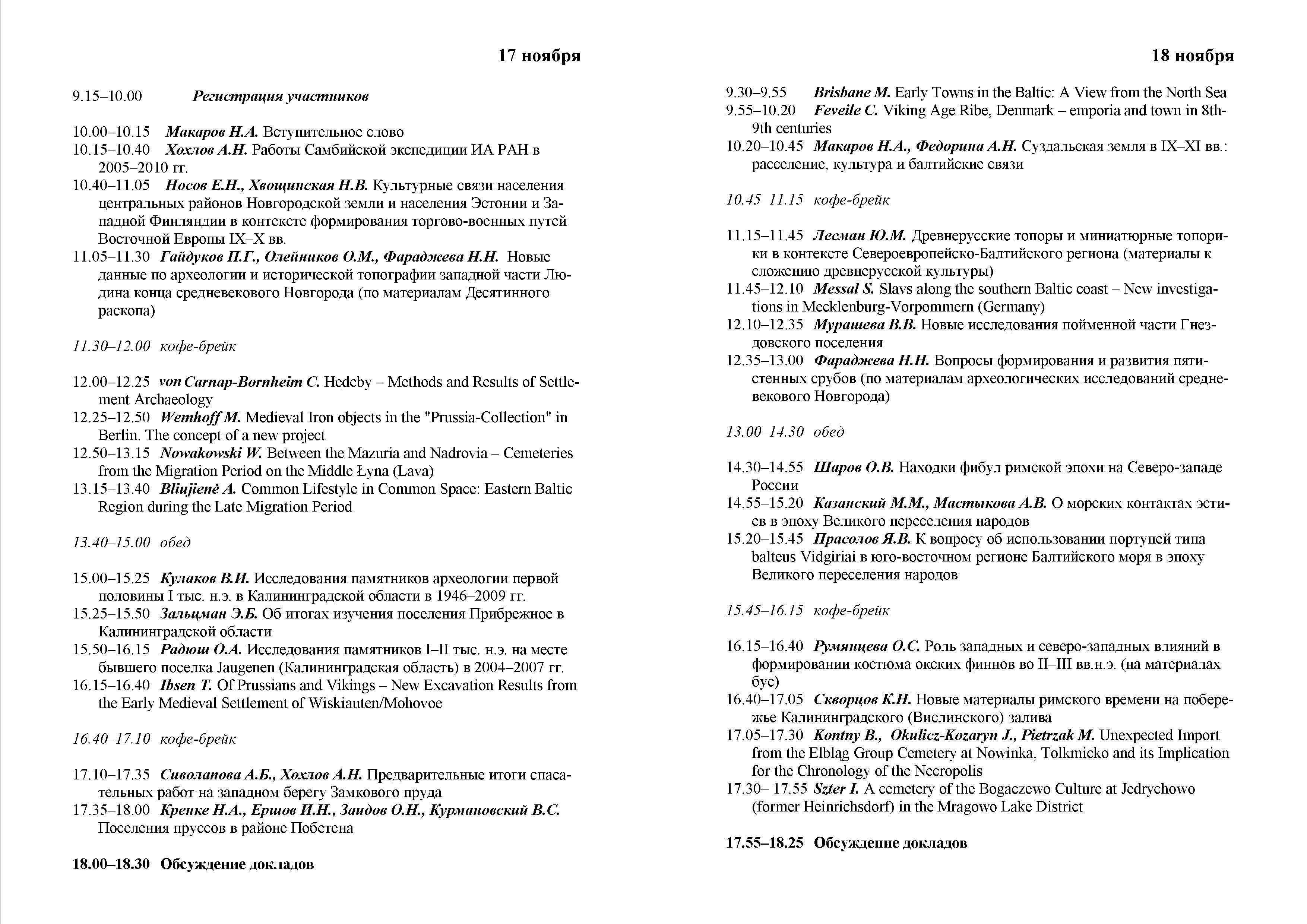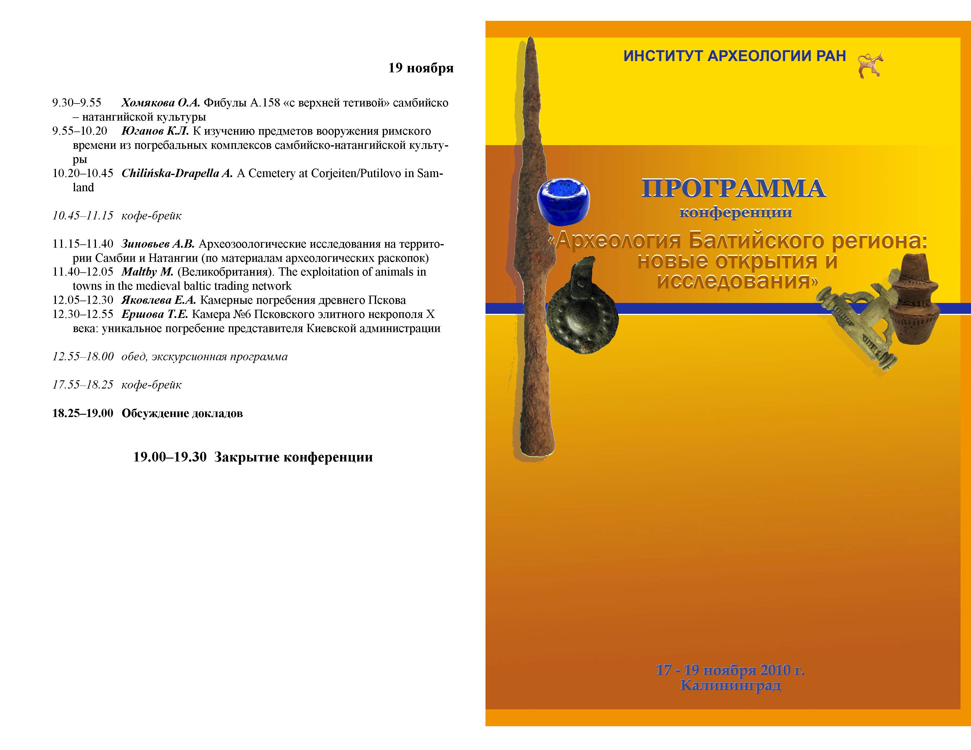 17-19 ноября 2010 г. в Калининграде прошла международная научная конференция «Археология Балтийского региона: новые открытия и исследования». На ней обсуждались новейшие материалы и актуальные проблемы изучения Балтийского региона и сопредельных территорий от эпохи неолита до начала нового времени. Инициатором проведения конференции и ее основным организатором стал Институт археологии, силами которого в Калиниградской области ведутся интенсивные археологические раскопки. Важнейшее место среди них занимают спасательные работы Самбийской экспедиции под руководством А.Н. Хохлова, позволившие получить значительный корпус новых материалов по археологии Янтарного края. Другим фактором, способствующим активизации археологического изучения данного региона, стали международные научные проекты, и, прежде всего, совместное исследование одного из торговых центров эпохи викингов – поселения Моховое–Вискиаутен и могильника Кауп, выполняемое Институтом археологии и Музеем Шлосс-Готторф (Шлезвиг, Германия, руководители работ – В.И. Кулаков и Т. Ибсен).