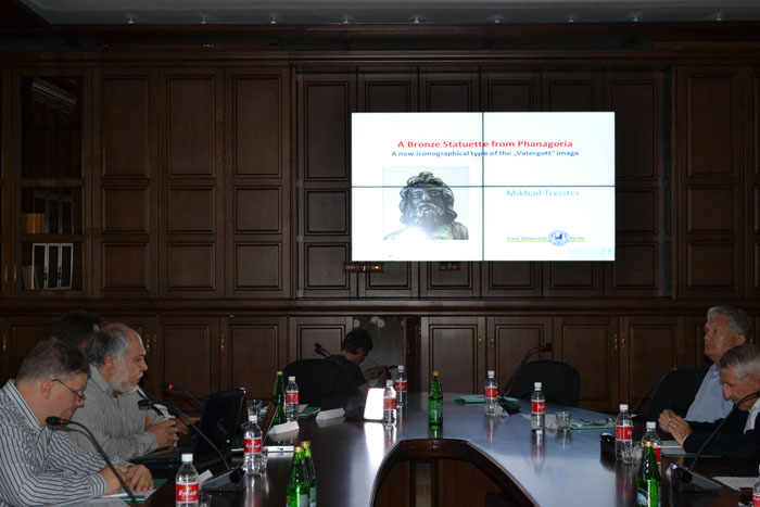 Во вступительном слове руководитель Фанагорийской экспедиции, заведующий отелом классической археологии Института археологии д.и.н. В.Д. Кузнецов рассказал о Фанагории, истории изучения памятника, блестящих находках и открытиях последних лет, об открывшемся научном центре. В докладе генерального секретаря Германского археологического института О. Далли были освещены результаты недавних исследований Таганрога и его окрестностей. Известный украинский археолог, директор благотворительного фонда «Деметра» д.и.н. В.Н. Зинько представил вниманию участников симпозиума результаты исследований Европейского Боспора в эпоху поздней архаики. Заведующий кафедрой истории древнего мира исторического факультета МГУ, д.и.н., проф. С.Ю. Сапрыкин ознакомил коллег с новыми эпиграфическими памятниками Северного Причерноморья. П. Дюпон, научный сотрудник университета г. Лион (Франция) в своем выступлении акцентировал внимание ученых на возможностях естественнонаучных методов при интерпретации археологического материала. Чл.-корр. РАН, проф. А.И.Иванчик выступил с результатами работы над интернет-проектом IOSPE-3, главной целью которого является сбор и систематизация древнего эпиграфического материала Северопонтийского региона. Д.В.Журавлев и У. Шлотцауэр осветили новые результаты изучения греческой колонизации Таманского полуострова: работа над проектом ведется Государственным историческим музеем и Германским археологическим институтом. Доклад научного сотрудника Института археологии С.В. Ольховского о затопленном античном корабле, найденном в этом году в акватории Фанагории, вызвал живой интерес участников конференции. Эта уникальная находка еще ждет дальнейшего, более обстоятельного изучения, 3D-реконструкции и публикации. Научный сотрудник Института переднеазиатской археологии Свободного Университета Берлина, д.и.н. М.Ю. Трейстер рассказал о неопубликованной находке из раскопок Фанагории - небольшой бронзовой статуэтке мужского божества середины II – I половины III в. н.э. В докладе сотрудника Геттингенского университета Н.Л. Поваляева были затронуты дискуссионные вопросы формы правления на Киммерийском Боспоре в VI-III вв. до н.э. Материалы симпозиума будут опубликованы в очередном томе Altertümer Phanagorias, издаваемых в Геттингене при участии сотрудников Фанагорийской экспедиции.